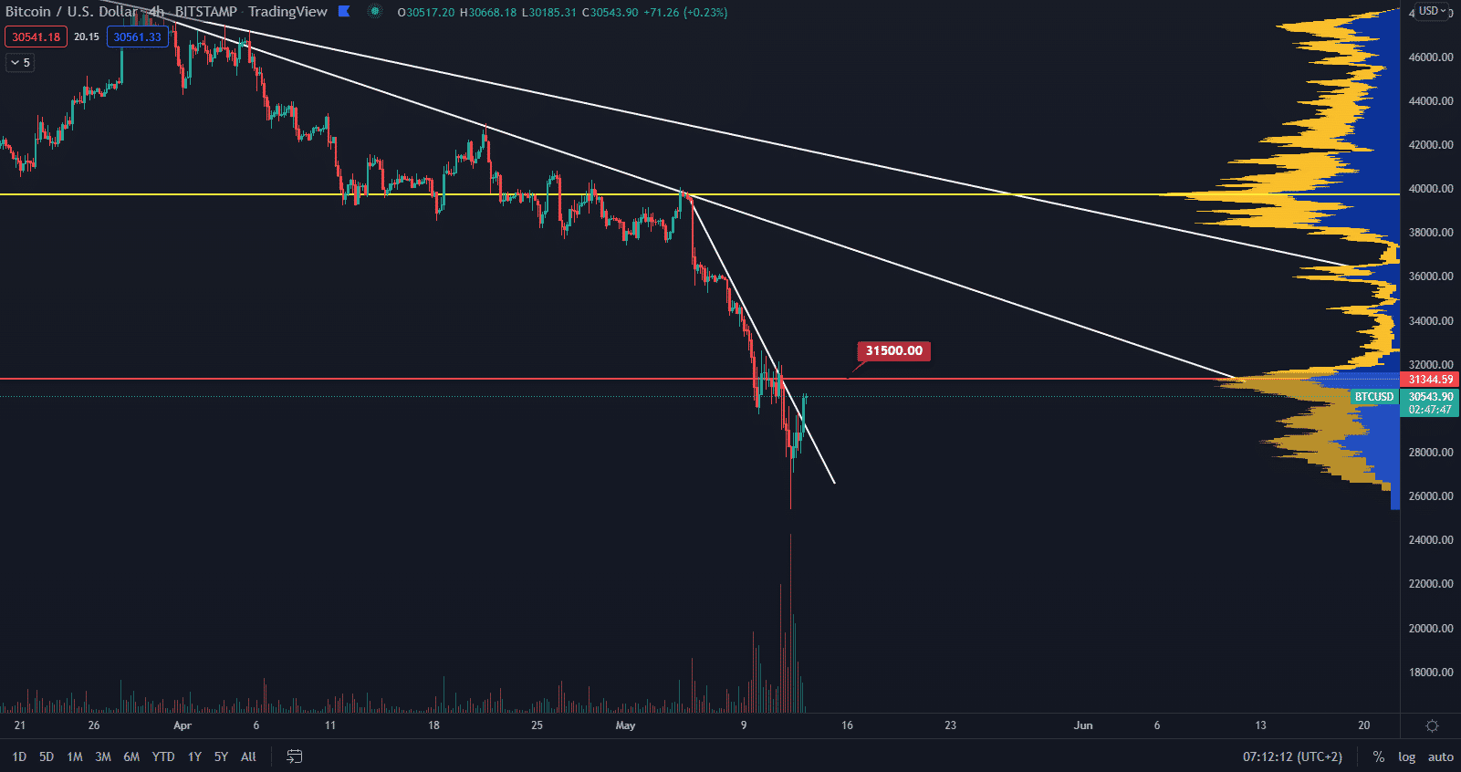 Netreba zabúdať na fakt, že sme v hlbokej korekcii a od reverzie trendu sme ďaleko. Ak chceme rozmýšľať nad reverziou, tak potrebujeme prekonať 37 000 $ a 41 000 $. Momentálne z krátkodobého hľadiska preto nemá zmysel hovoriť o otočení trendu, ale skôr o formovaní minima.