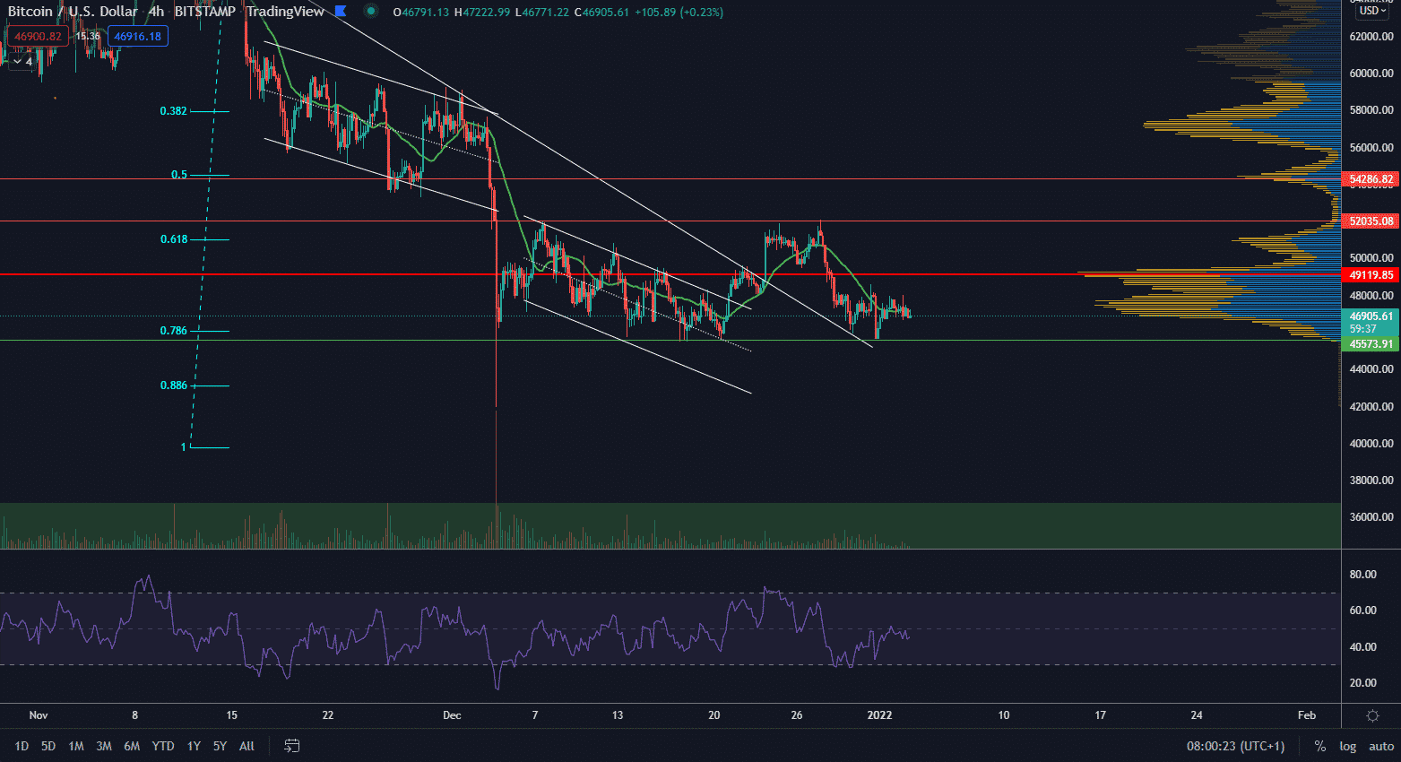 Kľúčový support sa nachádza zhruba na hladine 45 600 $ a cena ho rešpektovala už 5-krát. Na druhej strane sa nachádza rezistencia v hladine 52 000 $, ktorú cena otestovala už 3-krát. Medzi týmito hladinami sa nachádza sideway pohyb, ktorý môže predstavovať akumulačnú zónu pred ďalším rastom. Na to však support musí byť udržaný.