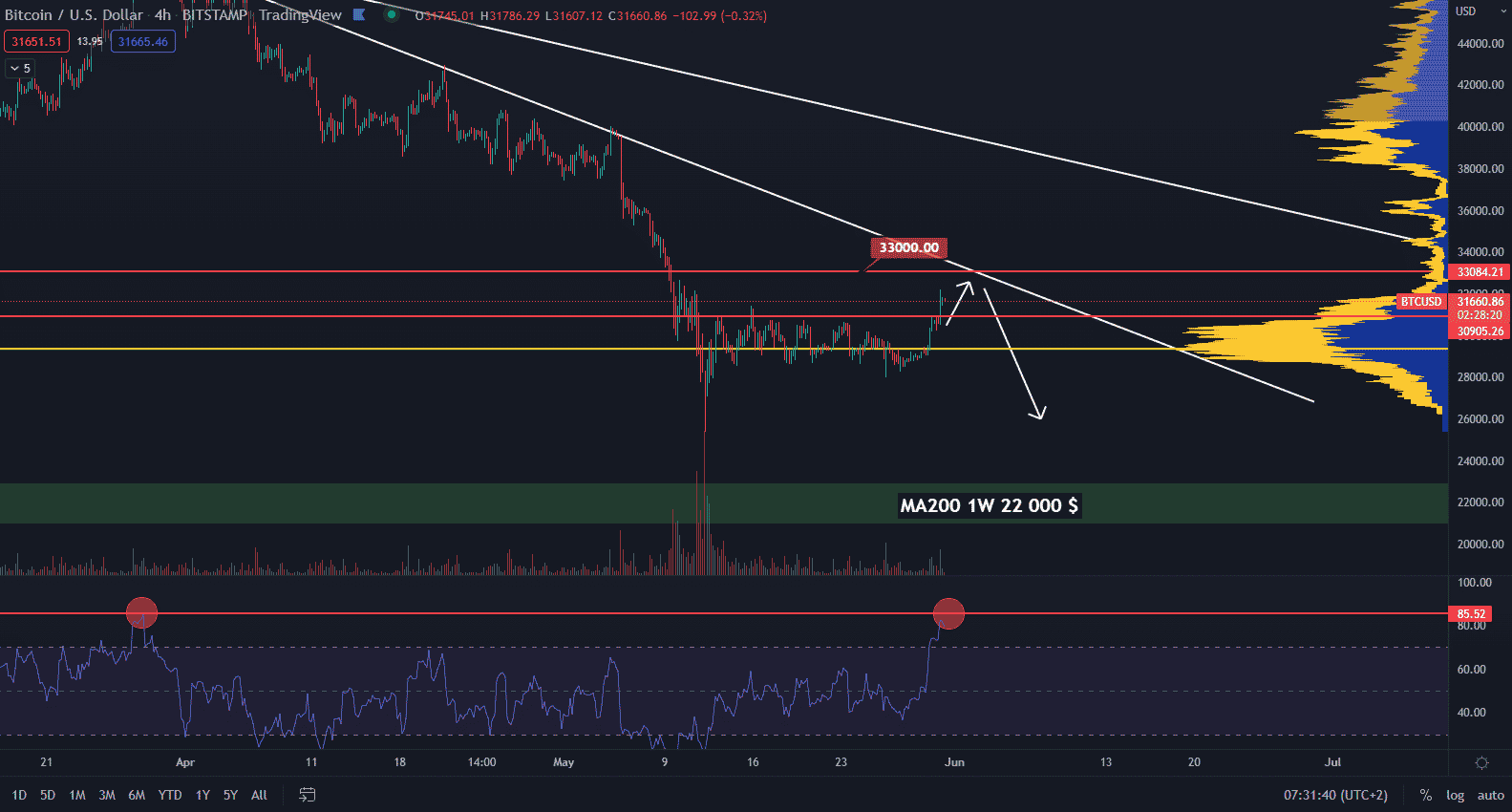 Posledný týždeň sme si ukazovali aký target sledovať v prípade, že cena prerazí rezistenciu sideway pohybu. Najbližší target je zóna okolo 33 000 $, čo znamená, že rast sa blíži ku koncu. Tento target vyplýva z rezistencie lokálnych maxím korekčného legu, v ktorom sa cena nachádza.