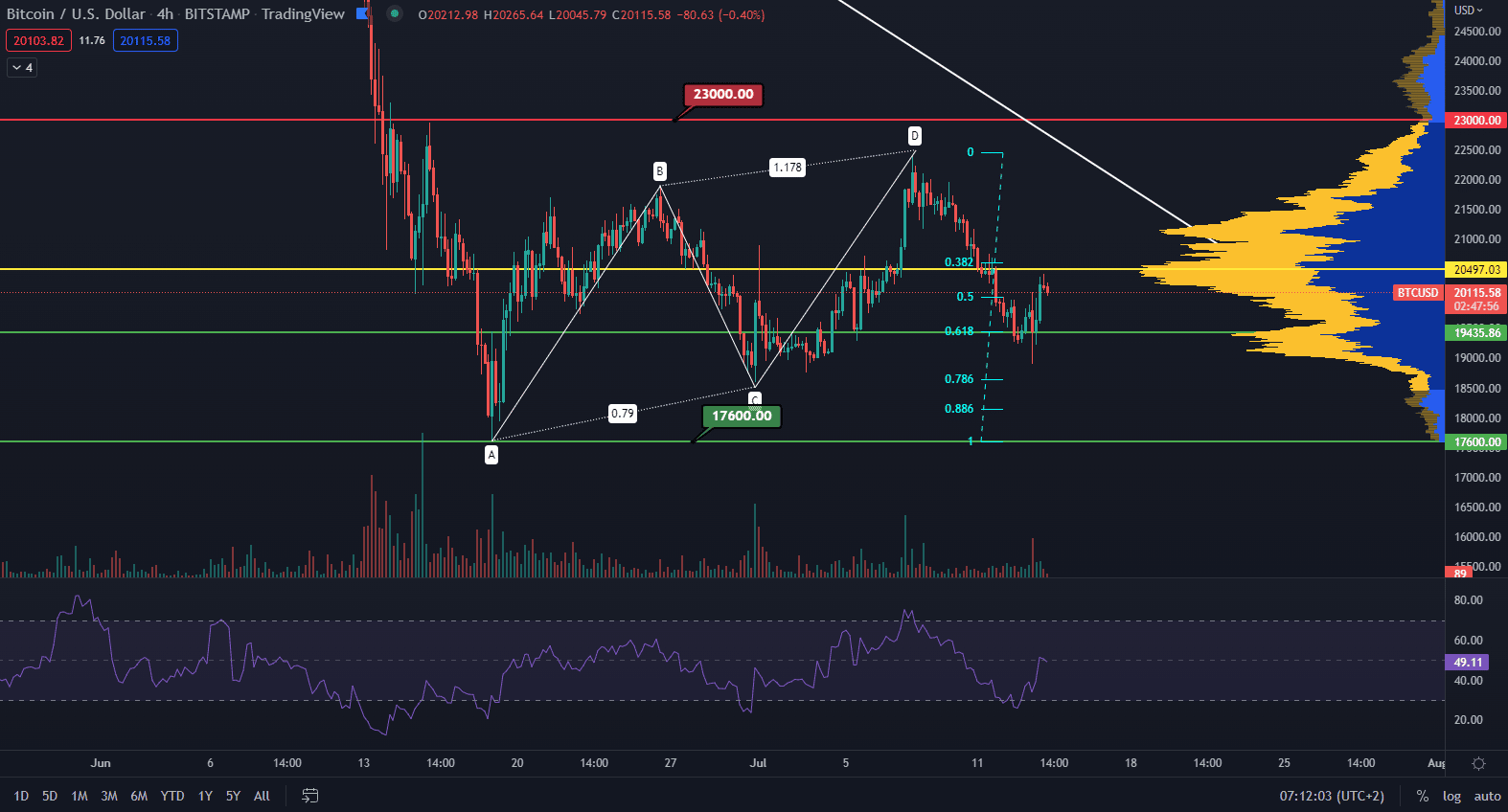 BTC rešpektoval support druhého targetu 19 500 $ na 61,8 % retracemente vyplývajúceho z harmonického patternu AB = CD. Cena potvrdila lokálne minimum a začala rásť až na point of control 20 500 $. Tento pohyb je však stále iba súčasťou sideway štruktúry ohraničenej minimom 17 600 $ a maximom 23 000 $.