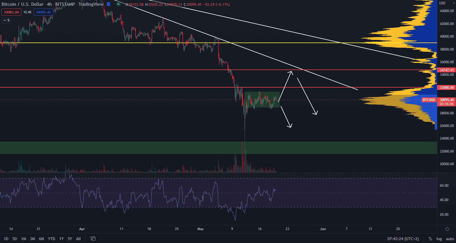 Z krátkodobého hľadiska sledujem predovšetkým dva scenáre, ktoré sú súčasťou dlhodobejšej korekčnej štruktúry. V prvom scenári počítam s prerazením sideway štruktúry a vytvorením rastúceho legu. Signál nastane pri prekonaní 31 400 $ s targetom na zhruba 35 000 $. Stále však budeme hlboko v korekcii.