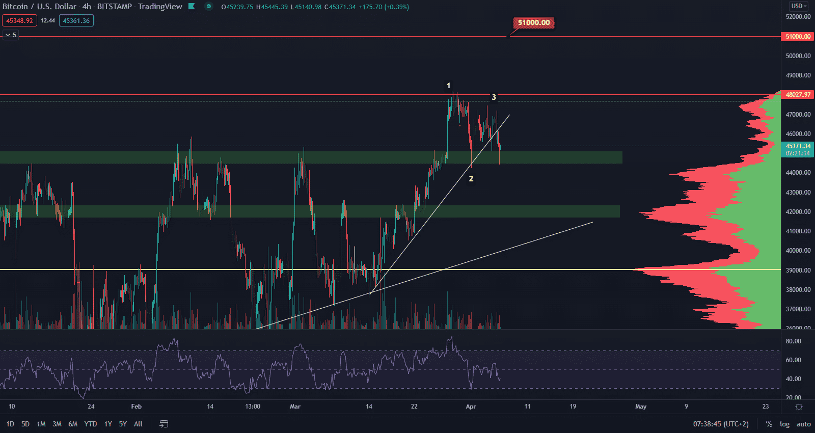 Bod 2 narazil na rezistenciu, ktorá je definovaná hladinou point of control celej viac ako ročnej sideway štruktúry, ohraničenej hodnotou 29 000 $ a 69 000 $. Takže nie je to len nejaká bezvýznamná rezistencia. A aktuálne vidíme, že s ňou má cena problém prelomiť ju.