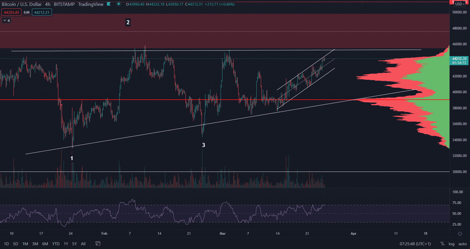Sentiment sa môže zmeniť z hodiny na hodinu, a preto je potrebné počkať si, ako sa cena bude správať v kontakte s rezistenciou 46 000 $ a nižšie. Mohli by sme polemizovať aj nad symetrickým trianglom, čo by znamenalo, že trhová cena už na rezistencii je. Prerazenie 46 000 $ však predstavuje elimináciu väčšieho rizika ako prerazenie 44 000 $, keď si ešte nie sme istí ukončením patternu.