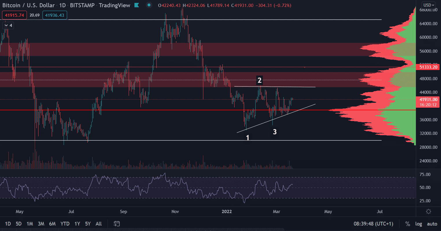 Zdá sa tak, že cena bude útočiť na rezistenciu 46 000 $ a budeme sledovať, či ju prerazí. Bullish target sledujem na hladine cca 51 000 $. To, že cena prerazí 46 000 $, neznamená, že vznikne dlhodobý bullish trend. Skôr pôjde o krátkodobý rastúci leg a následne sa uvidí aj podľa objemov, či bude udržaný.