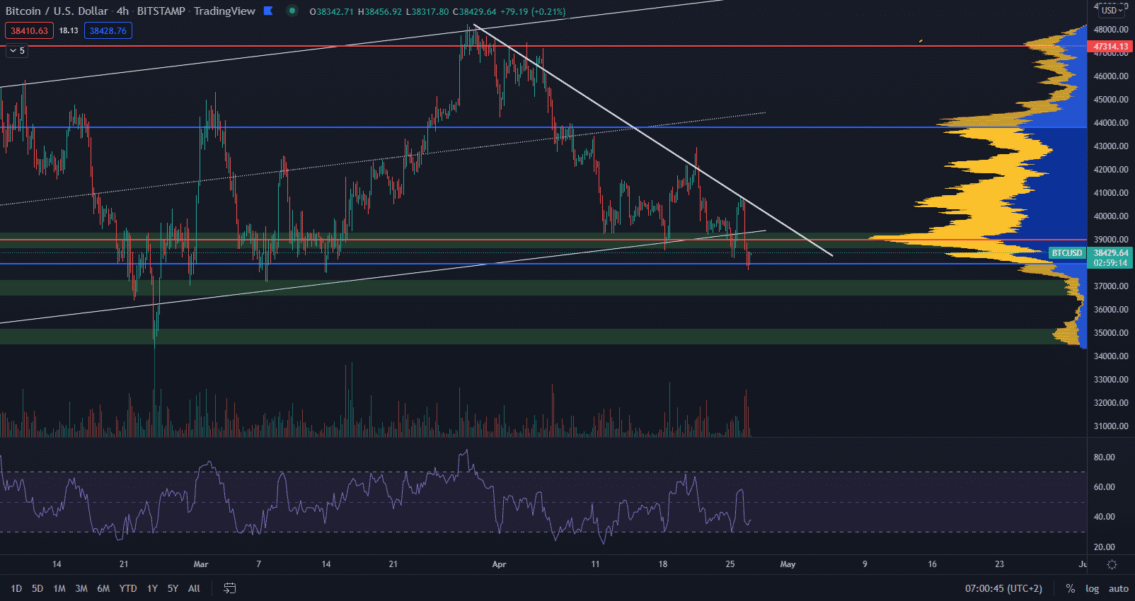 Minimum identifikujeme na základe reverzného patternu 123 bottom formation alebo na základe v-shape recovery. Nás však bude zaujímať skôr prerazenie súčasnej rezistencie z maxím korekcie, ktorá sa nachádza zhruba na 39 700 $ v čase písania článku a taktiež prerazenie posledného krátkodobého maxima, ktoré je momentálne na hladine 40 800 $.
