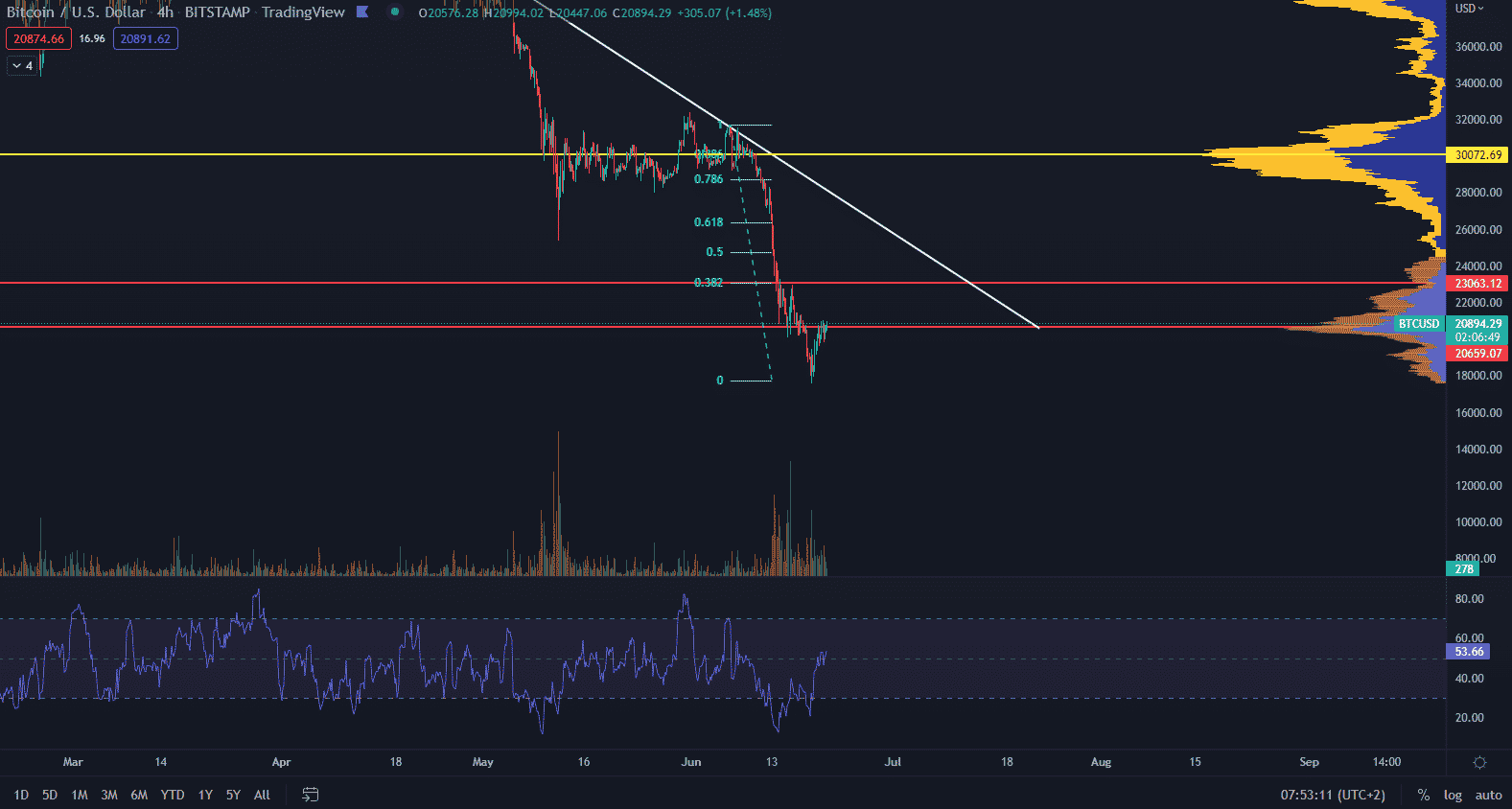 RSI vyformovalo na krátkodobej perióde pozitívnu divergenciu, čo hovorí o obrate trendu, no len z krátkodobého hľadiska. Trhová cena je presne na point of control 20 700 $, čo predstavuje rezistenciu. Zatiaľ ale cena nereaguje a ďalším bullish targetom by mohla byť hladina 23 000 $.