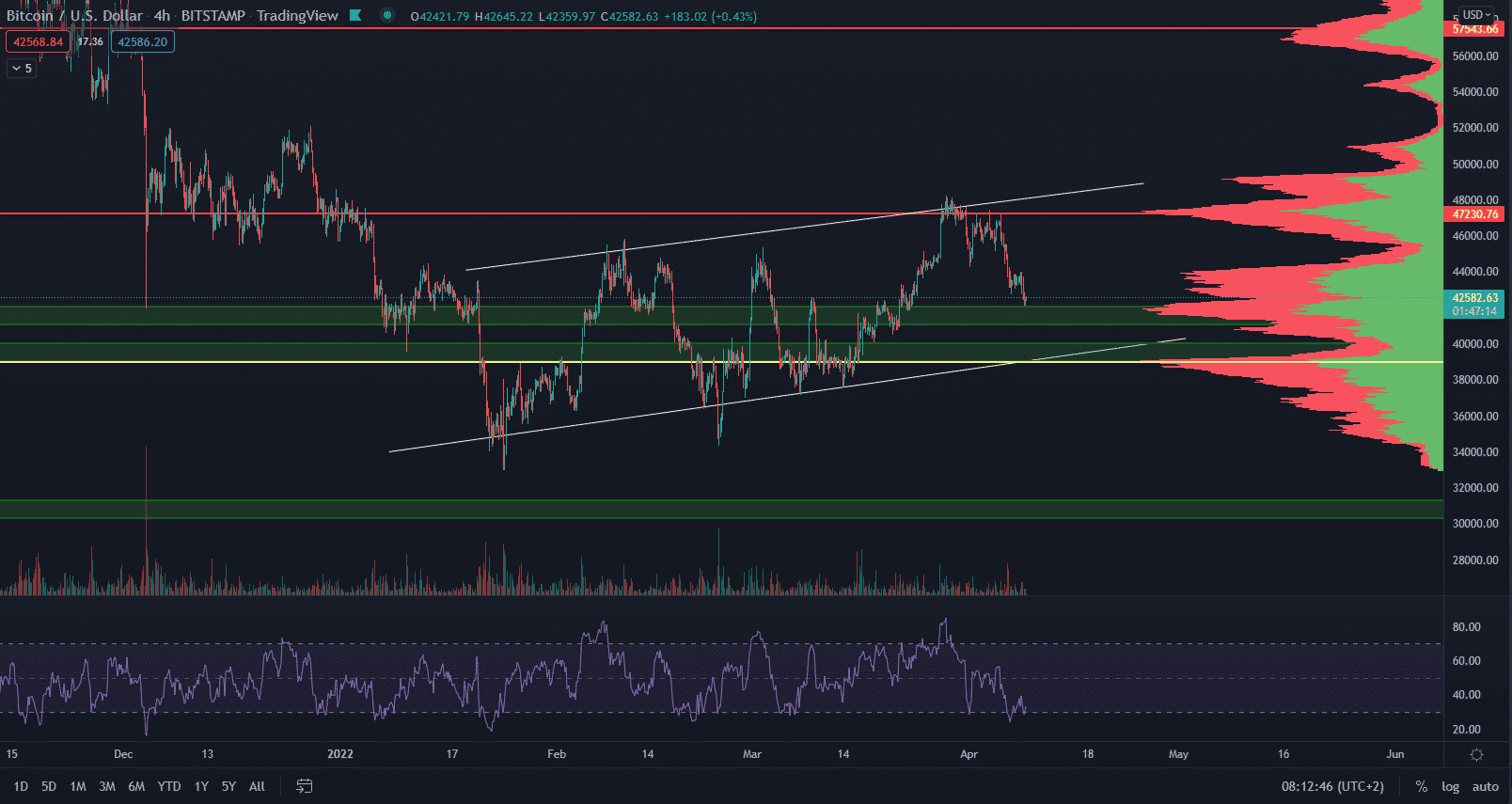 Z krátkodobého hľadiska sa nachádza najbližšia suppotná úroveň na cca 42 000 $. Túto zónu už Bitcoin kontaktoval, no zatiaľ bez odrazu. Predovšetkým však budeme sledovať významnejší support na zóne od 39 000 $ do 40 000 $. Okrem toho, že ide o support súčasnej vlajky, ide aj o dôležitú reverznú zónu počas celého posledného roku.