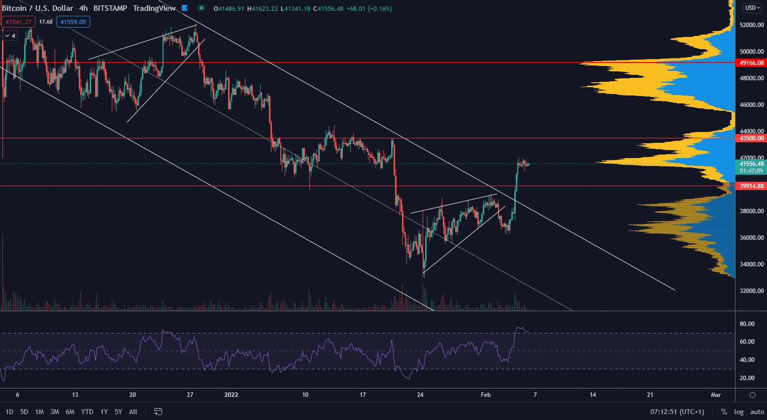 Bitcoin sa z krátkodobého hľadiska zastavil na rezistencii 41 500 $. Napriek tomu však nedošlo k reverzii trendu a cena stagnuje, čo znamená, že rast môže pokračovať. Cena zatiaľ stále neprekonala predošlé dlhodobé maximum, a tak nevieme, či ide o počiatok dlhodobejšieho rastu alebo sideway štruktúry.