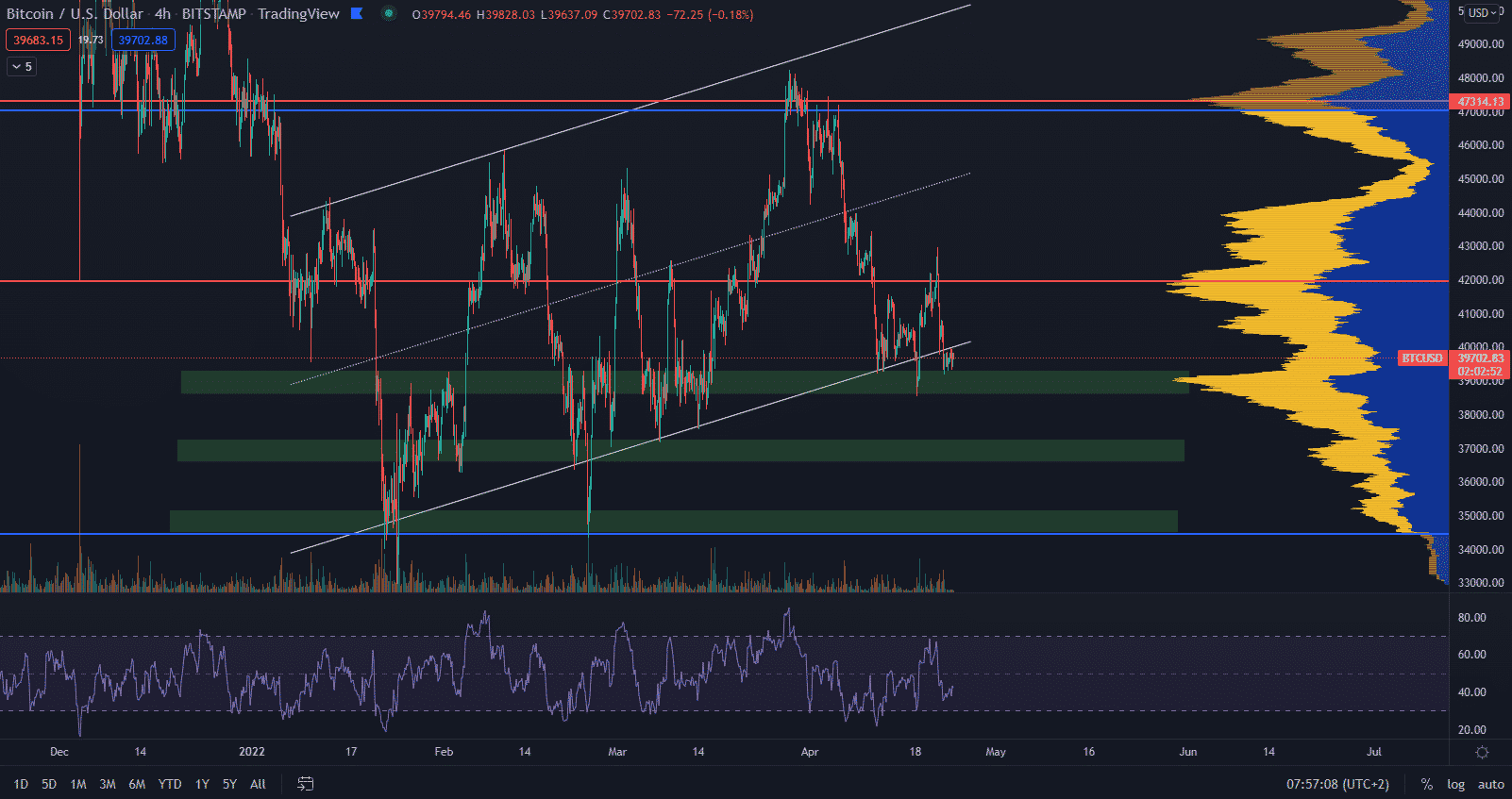 Bitcoin stagnuje tesne pod hladinou 40 000 $ a zatiaľ stále nedosiahol klesajúce minimum ani z krátkodobého hľadiska. Stačí však aj menší prepad a situácia sa okamžite zmení. Dominancia hlavnej kryptomeny medzitým pokračuje v sideway pohybe a dosahuje hladinu 41,62 %.