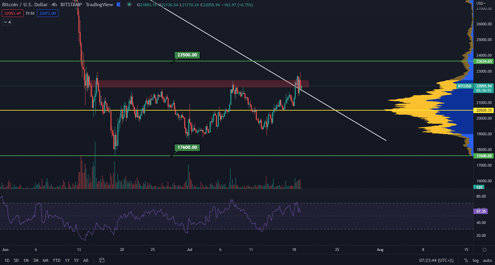 V prípade prerazenia očakávam bullish target 23 500 dolárov. Zásadná rezistencia sa nachádza až na 29 000 dolárov, no pri aktuálnych objemoch by bolo odvážne tvrdiť, že cena smeruje priamo na tento target. Ak by však došlo k dlhodobejšiemu rastu bullish objemov, bolo by to možné.