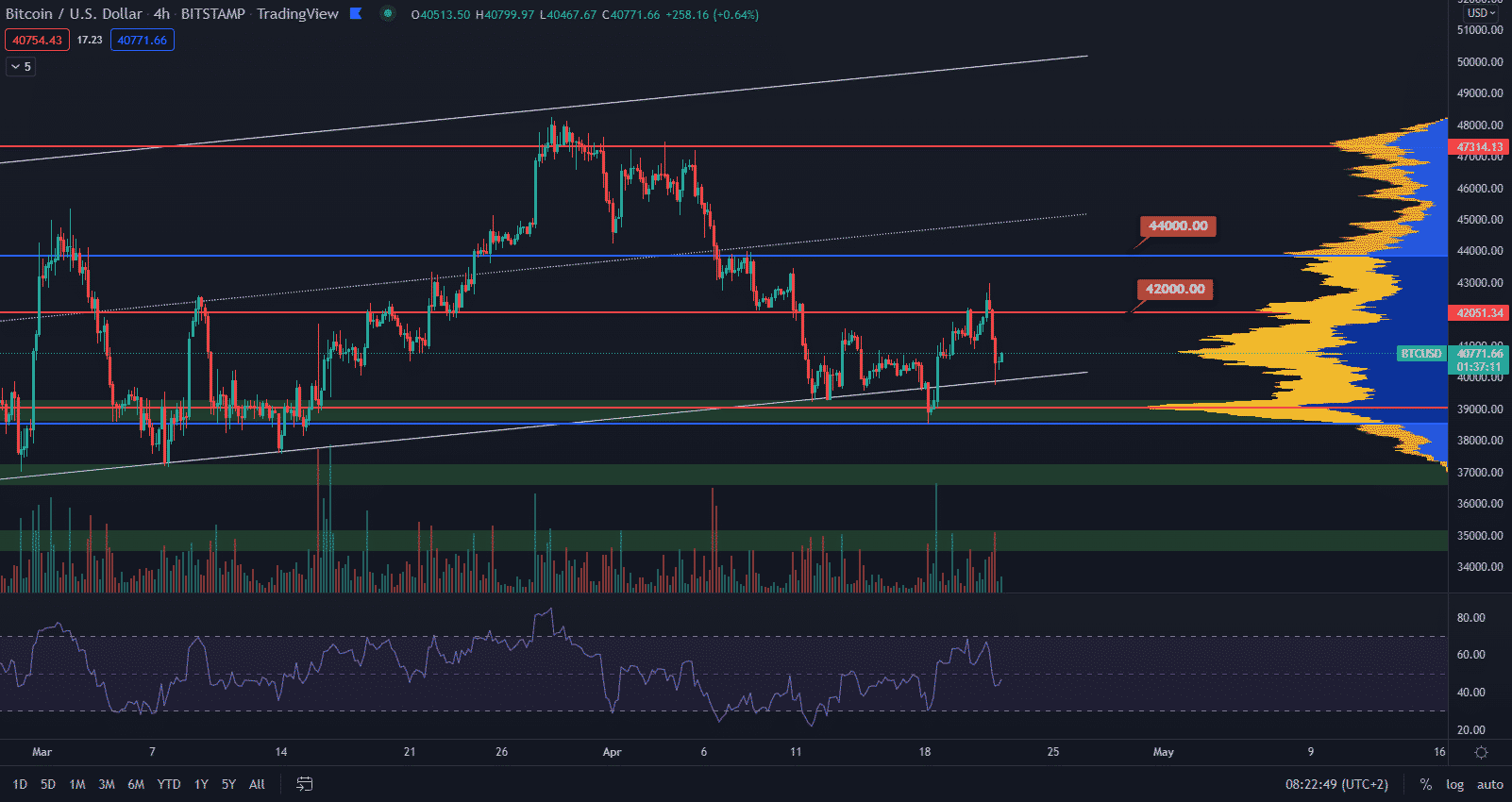 Bitcoin nakoniec vytvoril ďalší korekčný leg. Bearish sentiment teda prevláda a cena sa opäť dostala na hlavný support. Otázkou zostáva, či sa cene podarí tento support fungujúci od začiatku roka udržať alebo nie. Dominancia hlavnej kryptomeny medzitým pokračuje sideway a dosahuje 41,77 %.
