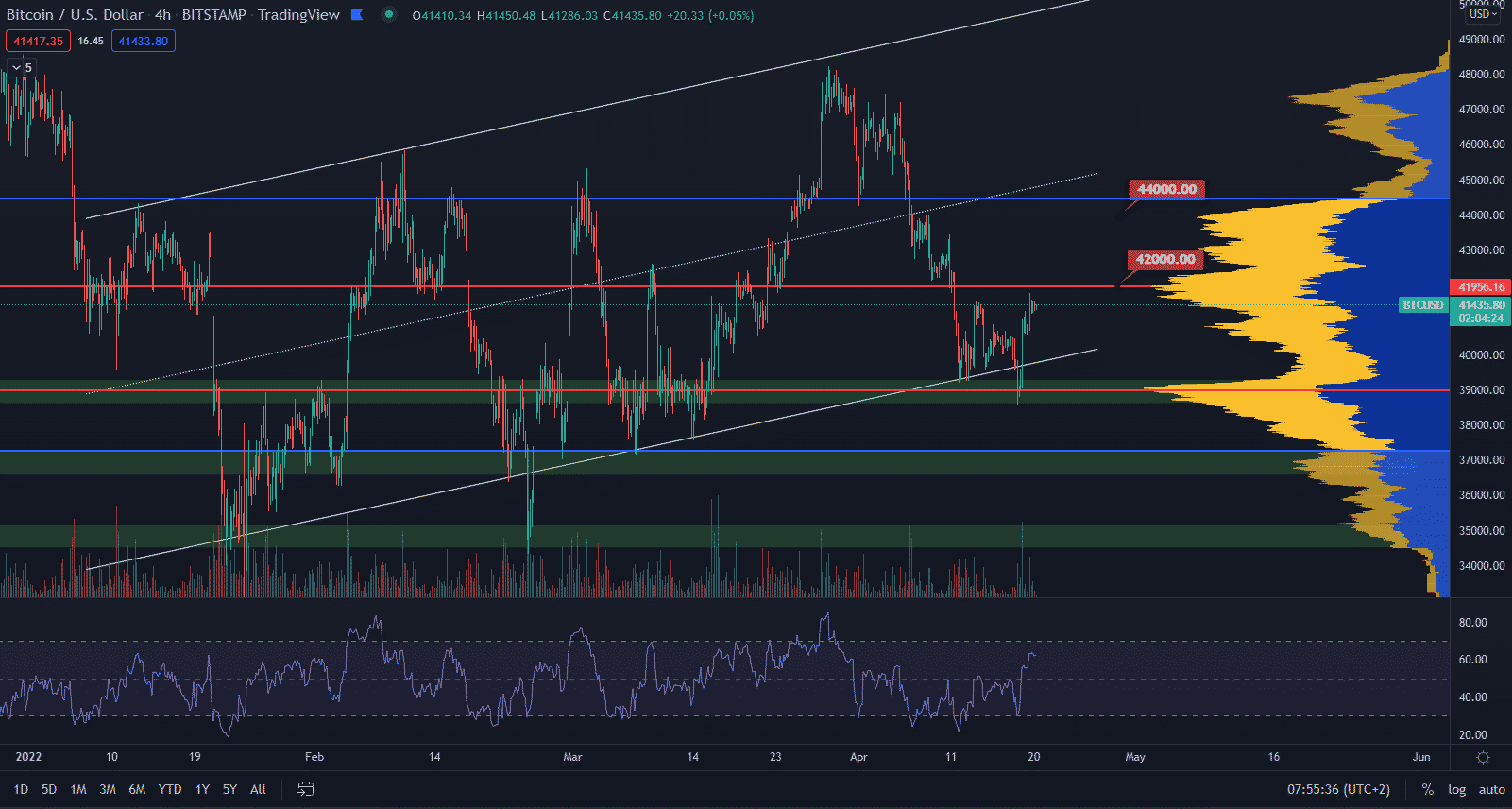 Bitcoin sa nachádza v rastúcom legu, ktorý trvá od minima na point of control 39 000 $ a práve testuje hladinu prvej rezistencie. Z krátkodobého hľadiska ostávame teda bullish a takisto aj z dlhodobého. Medzitým dominancia hlavnej kryptomeny pokračuje v sideway pohybe a momentálne sa nachádza na 41,67 %.