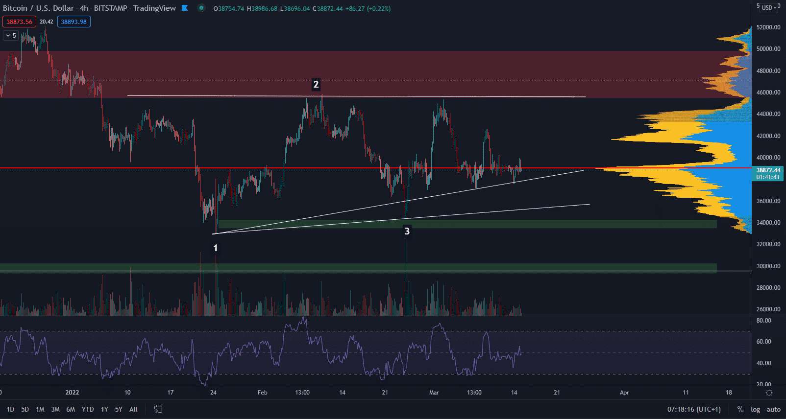 Nerozhodnosť Bitcoinu je nebezpečná a štruktúra sa môže ukončiť v podstate kedykoľvek. Môže však trvať aj niekoľko ďalších týždňov. Býčie objemy ustupujú a medvedie objemy za nimi stále zaostávajú. Kľúčový support sa nachádza na hladine okolo 33 000 $ až 34 000 $ v rozmedzí miním v bodoch 1 a 3.