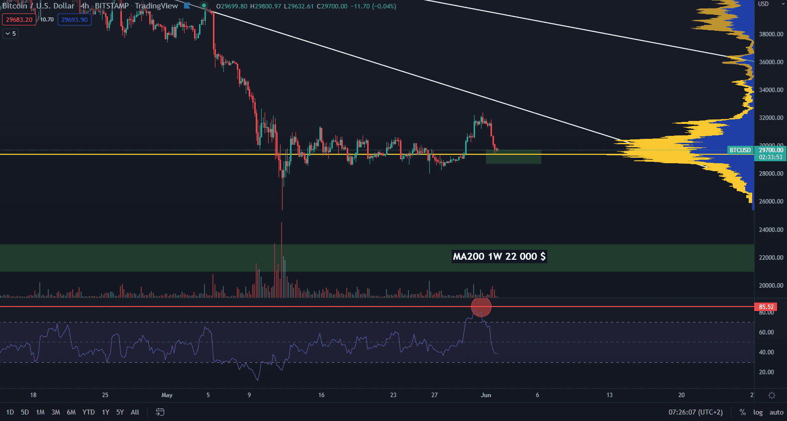 Práve na zóne okolo point of control by malo vzniknúť lokálne minimum. V prípade, že by sa tak nestalo a cena by support 28 500 $ neudržala, budeme opäť svedkami korekčného legu a pravdepodobne aj zvýšenej volatility. Bitcoin má totižto stále priestor na pokračovanie korekcie.