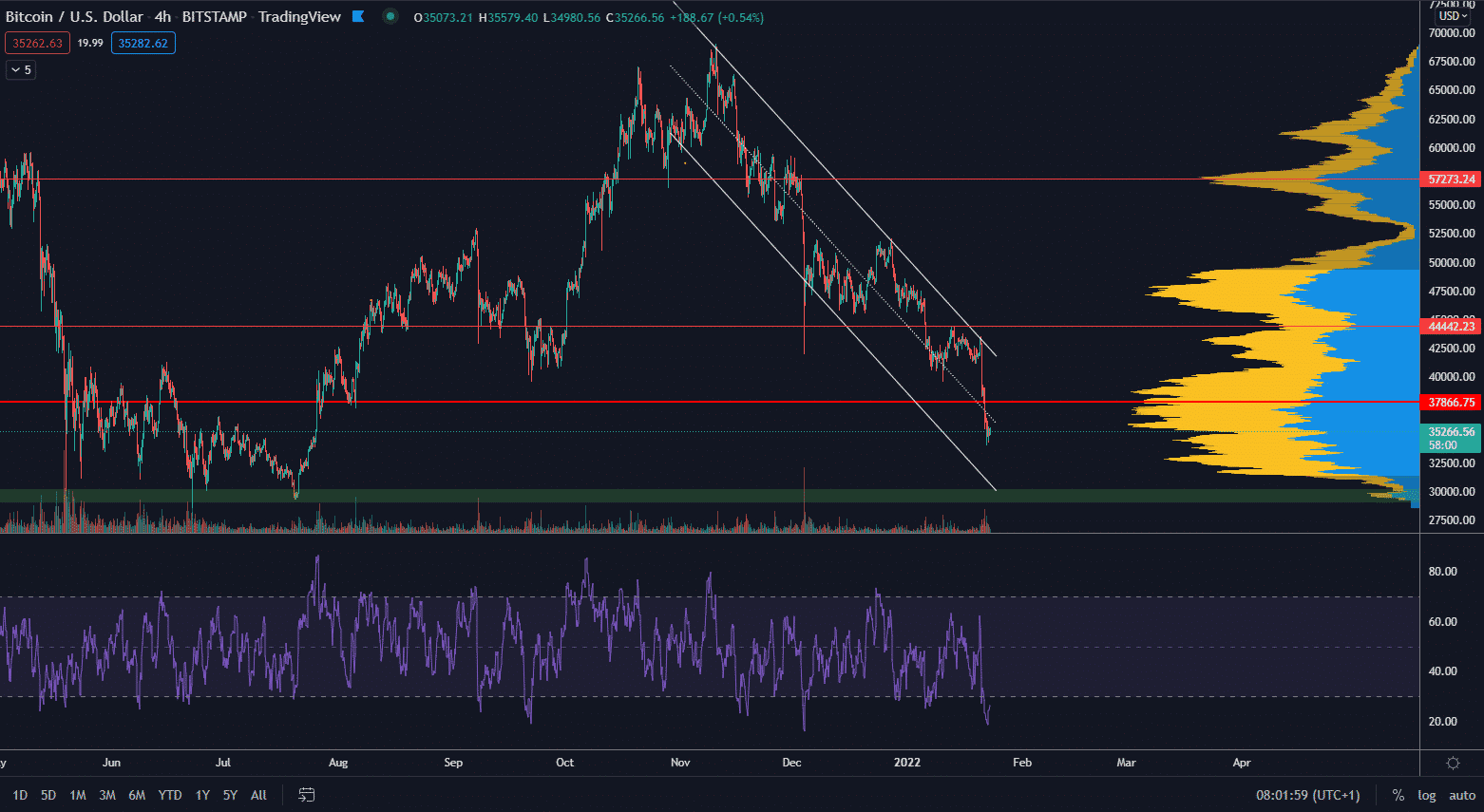 Trhová cena sa v čase písania článku nachádza na hladine 35 300 $, konkrétne v predošlej akumulačnej zóne medzi hladinami 30 000 $ a 40 000 $. Celá táto zóna sa vyznačuje vysokými objemami transakcií. Táto zóna tak môže byť reverznou aj v prípade súčasného poklesu ceny hlavnej kryptomeny.