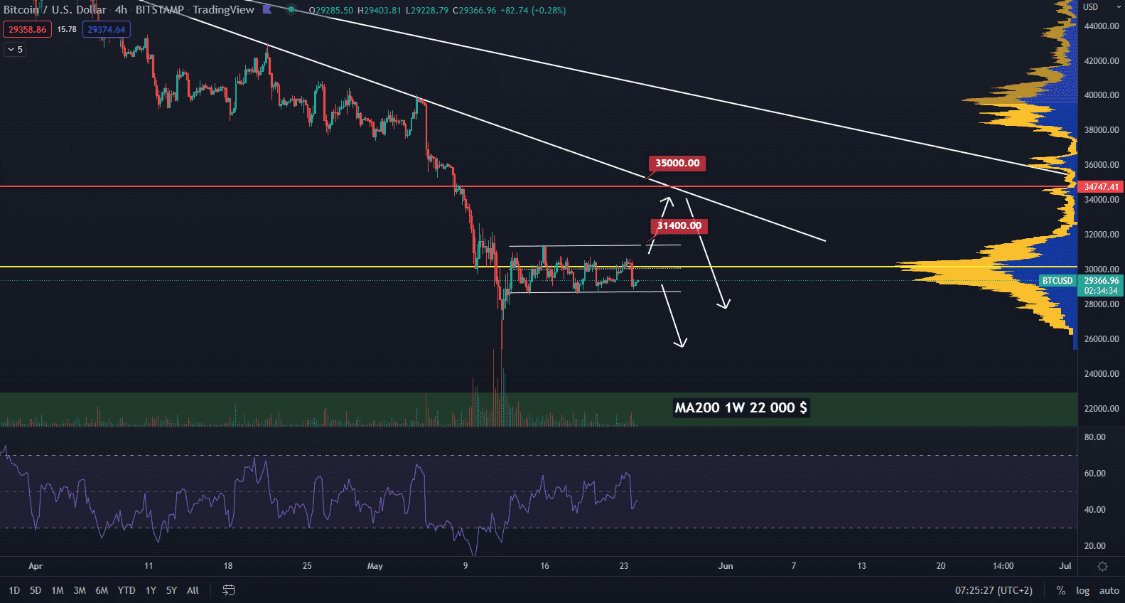 Z dlhodobého hľadiska sledujeme support na indikátore kĺzavého priemeru na týždennej perióde – MA200. Momentálne predstavuje zhruba 22 000 $ a v minulosti tento indikátor vždy symbolizoval absolútne dno korekcie a následne trvalo pár mesiacov, kým sa bullish trend potvrdil.