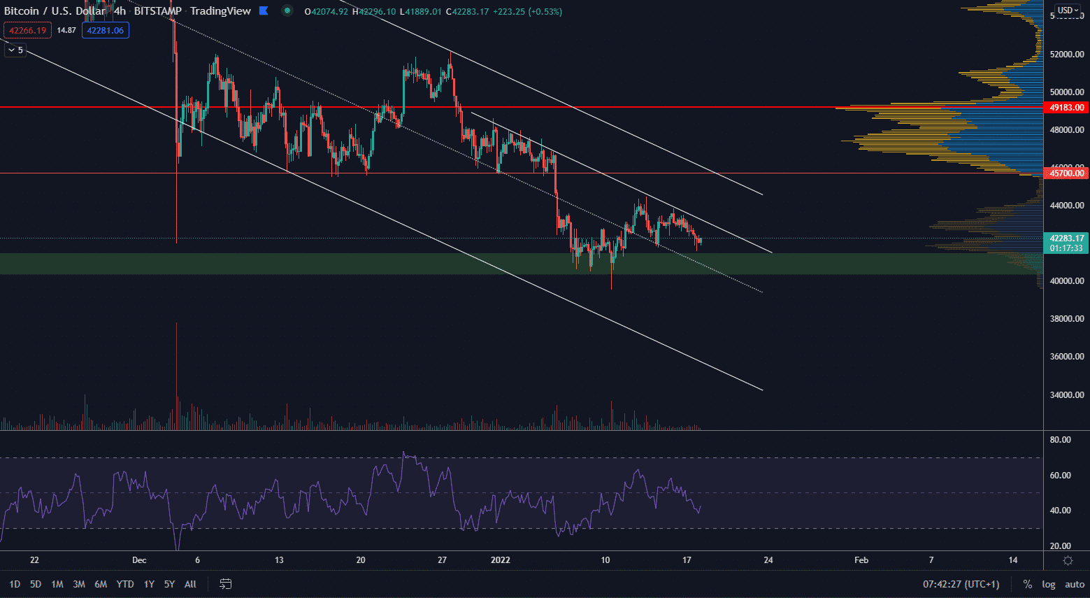 Bitcoin z krátkodobého hľadiska nezaznamenal vysokú volatilitu a viac-menej pokračuje bokom tesne nad úrovňou hlavnej supportnej zóny 40 000 $. Posledný odraz bol minimálny a napriek tomu, že BTC stagnuje nad 40 000 $, nevidíme objemy. Zdá sa, že z dlhodobého hľadiska by cena nemala pokračovať v medveďom trende.
