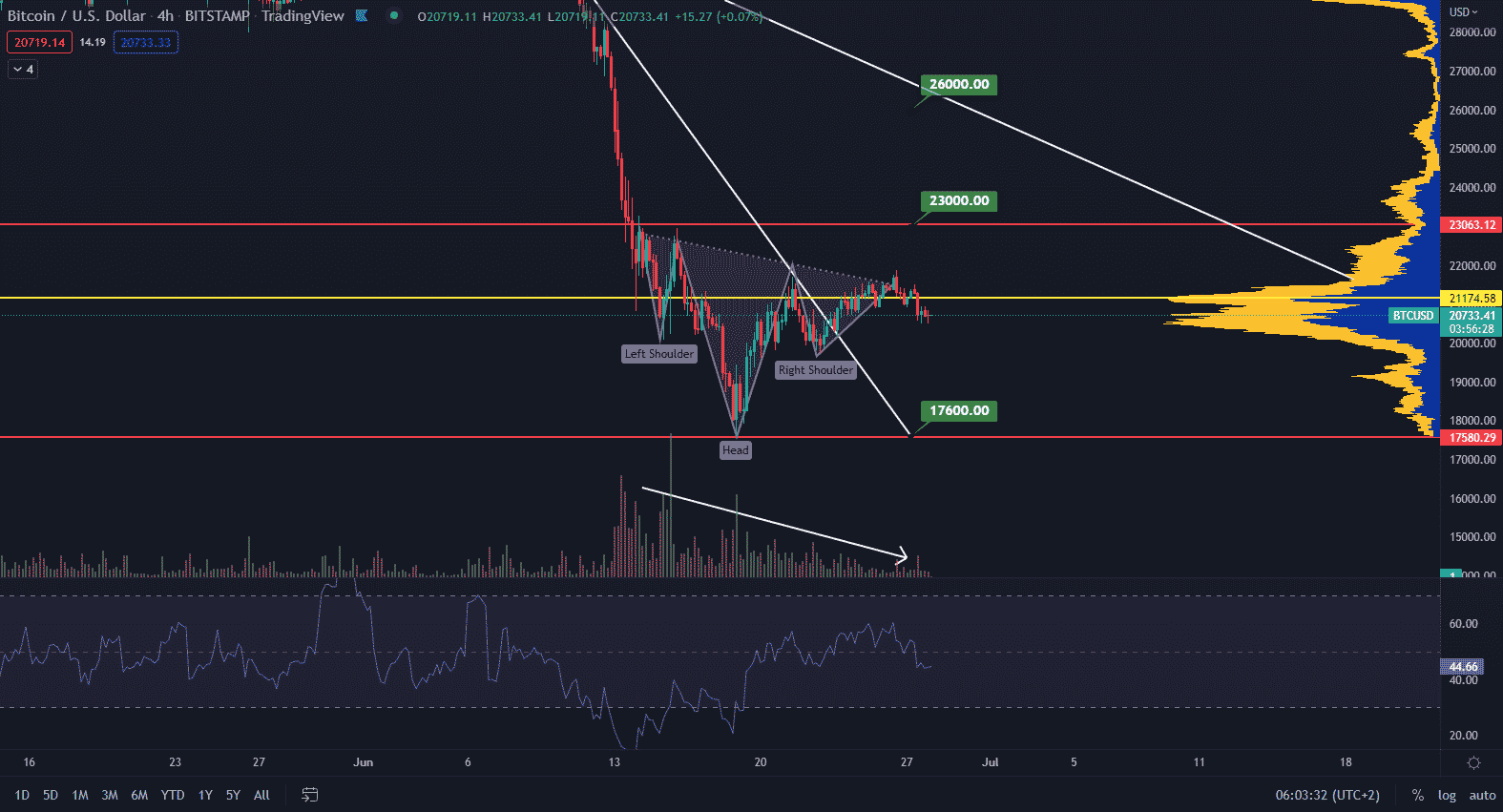 Objemy sa značne začínajú podobať tým z poslednej sideway štuktúry, ktorá trvala mesiac a nakoniec skončila prepadom cien. Podobne sa tak môže stať aj teraz. Cena bude pokračovať v sideway pohybe v rozmedzí 17 600 $ a 23 000 $. Podstatné bude sledovať nákupné objemy, ktoré sa musia navýšiť.