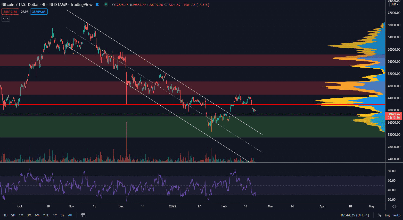 Trhová cena opäť vstupuje do supportnej oblasti od 31 000 $ do 38 000 $. Ide o najsilnejšiu supportnú oblasť v rámci celej sideway štruktúry, ktorá pretrváva vyše roka. RSI navyše vstupuje do prepredanej zóny, čo tiež signalizuje blížiace sa lokálne minimum. Napriek tomu má cena stále priestor aj z krátkodobého hľadiska klesať.