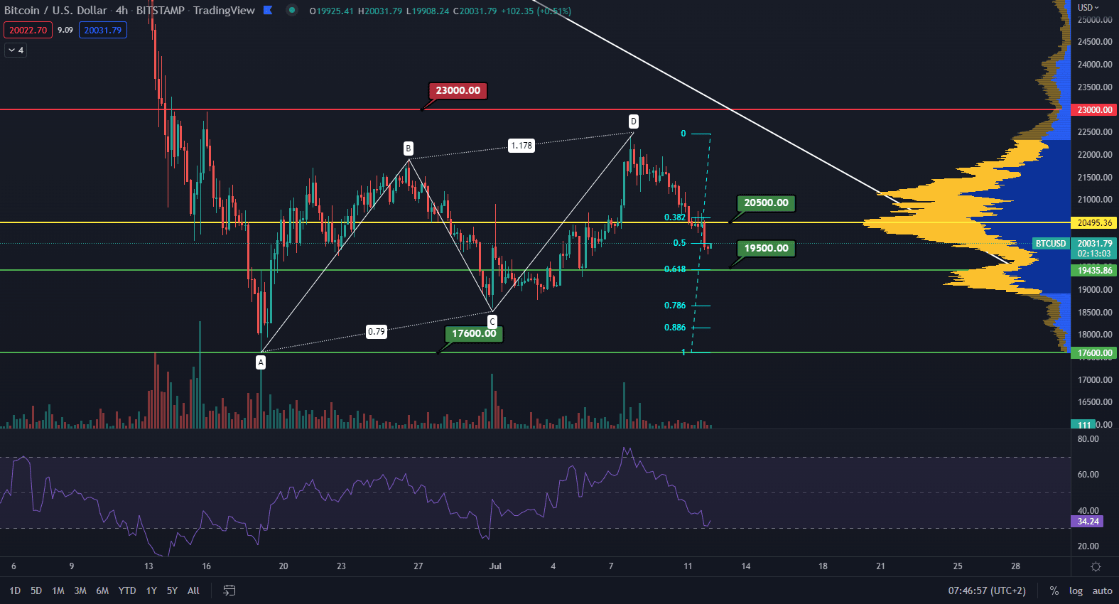 Harmonický pattern AB = CD má dva targety, a to na hladinách 38,2 % a 61,8 % retracementu. Tieto targety predstavujú hladinu 20 500 $ a 19 500 $. Zastavenie prepadu zatiaľ cena neindikuje a z krátkodobého hľadiska je stále bearish. Zo strednodobého hľadiska však pokračuje sideway.