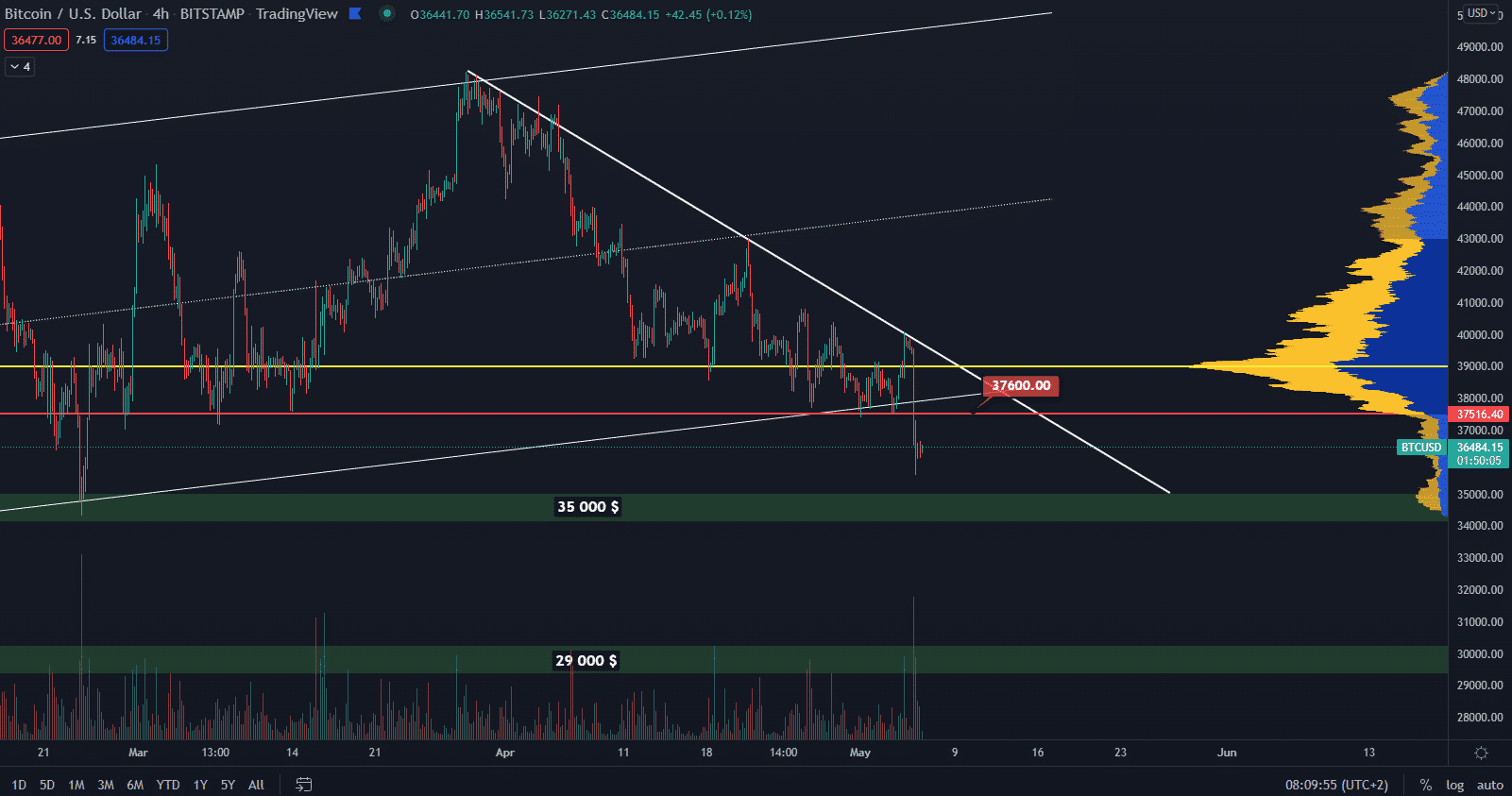 Z krátkodobého hľadiska je možné, že cena dosiahla lokálne minimum na hladine 36 000 $ a vytvorí krátkodobý pohyb smerom nahor k targetu 37 600 $. Tu sa totižto nachádza prvá najbližšia rezistencia od trhovej ceny. Následne však očakávam pohyb bokom s potenciálom prepadu na supportnú zónu okolo 35 000 $.