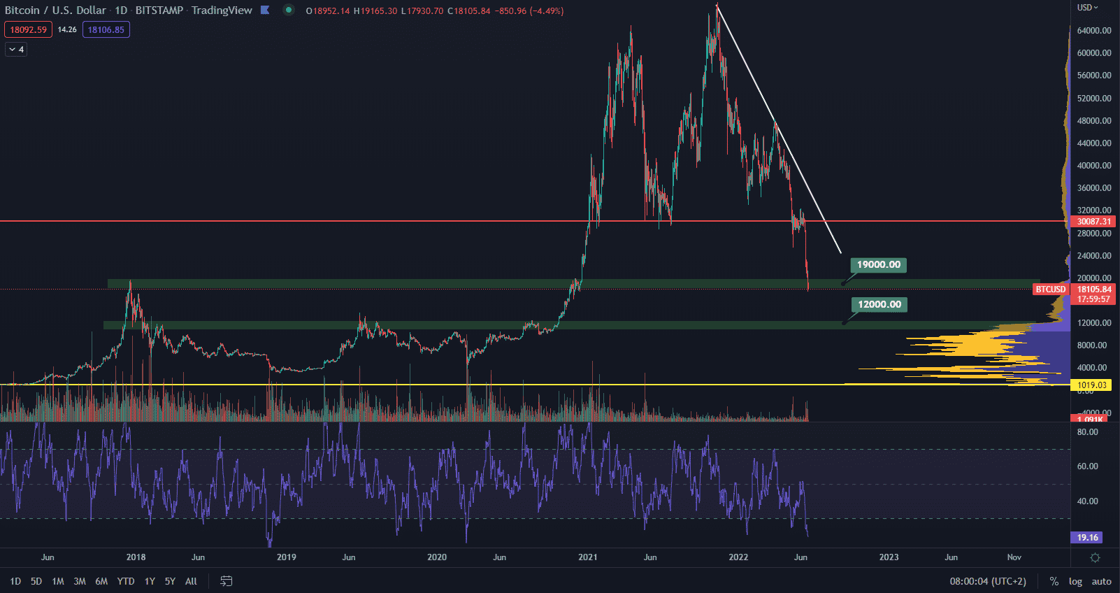 V čase písania článku sa Bitcoin obchoduje na hladine tesne nad 18 000 $. Je to prvýkrát v histórii, keď sa hlavná kryptomena prepadla späť do predošlého cyklu. Z technického hľadiska je najbližší support na zóne od 12 000 $. Práve v tejto oblasti začínajú obrovské transakčné objemy.