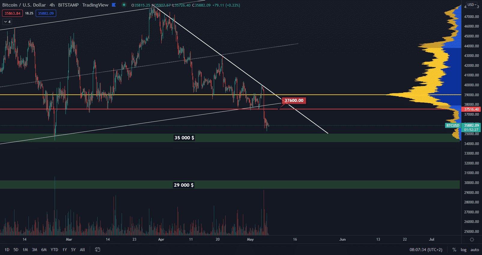 Ak naopak chceme uvažovať nad reverziou trendu, Bitcoin by musel prekonať rezistenciu z maxím korekcie, pričom prvý target by bol na point of control 39 000 $. My sa však nachádzame v korekcii, a preto z dlhodobého hľadiska okrem 35 000 $ budeme sledovať aj zónu 29 000 $ – 30 000 $.