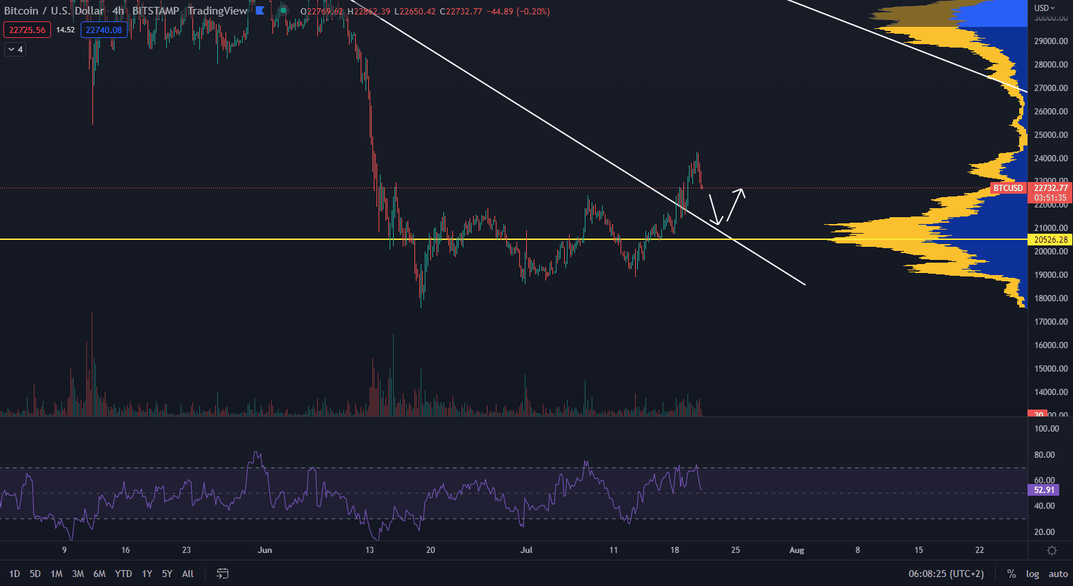 Bitcoin dosiahol lokálne maximum 24 280 dolárov a nachádza sa v krátkodobom klesajúcom trende. Cena pravdepodobne pôjde na najbližšiu hladinu supportu. Altcoiny, samozrejme, tento prepad kopírovali a taktiež sa dostávajú do krátkodobého prepadu. Zdá sa, že trh dosiahol nové krátkodobé lokálne maximum.