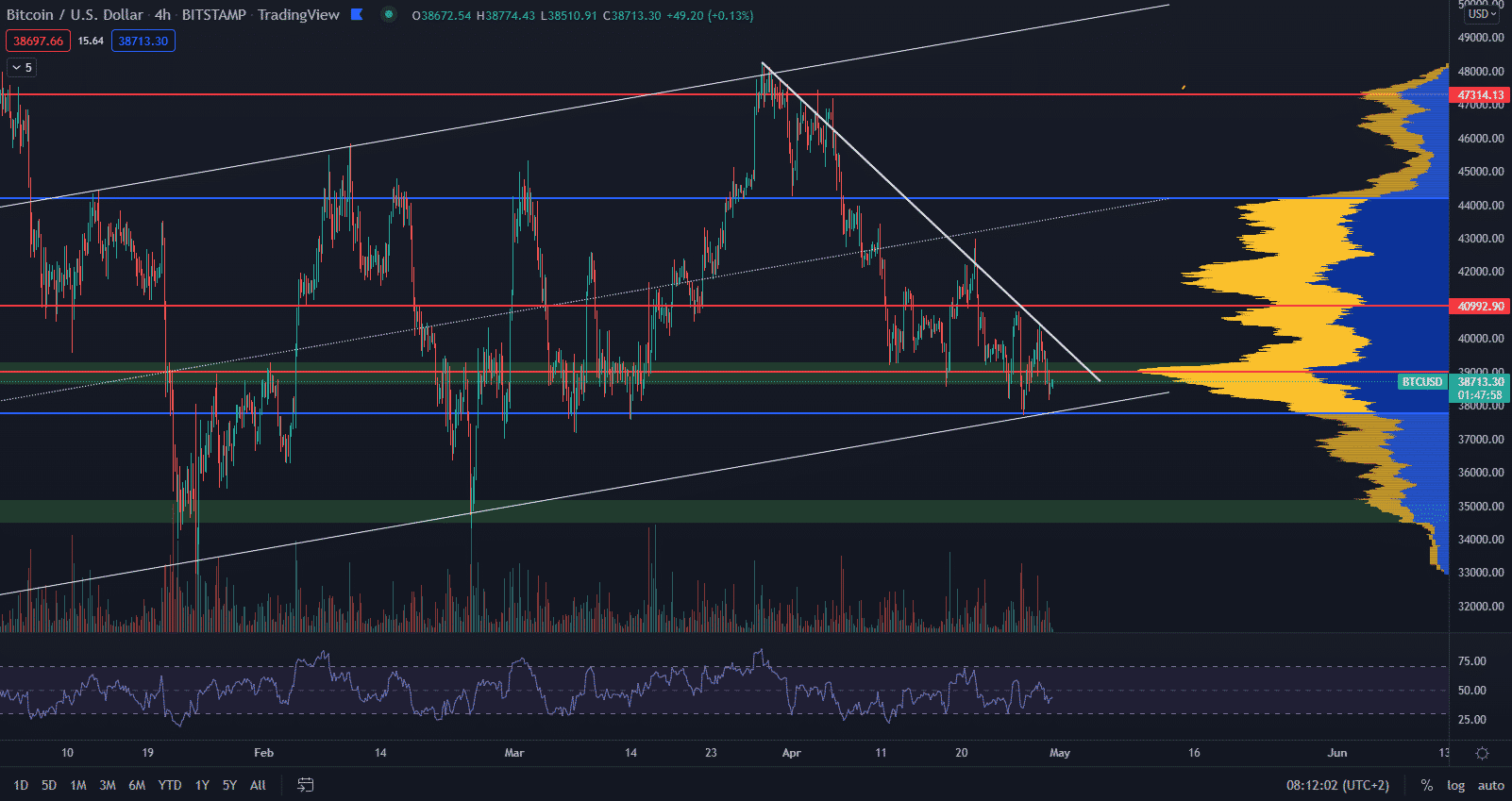 Ak rozmýšľame nad bullish scenárom, tak cena musí prekonať rezistenciu z maxím korekcie a navyše aj posledné maximum, ktoré je zhruba na hladine 41 000 $. Vtedy by sme targetovali hladinu 44 000 $. Zatiaľ však cena vyzerá skôr bearish a na supporte už nie sú také agresívne výkupy ako na predošlých minimách.