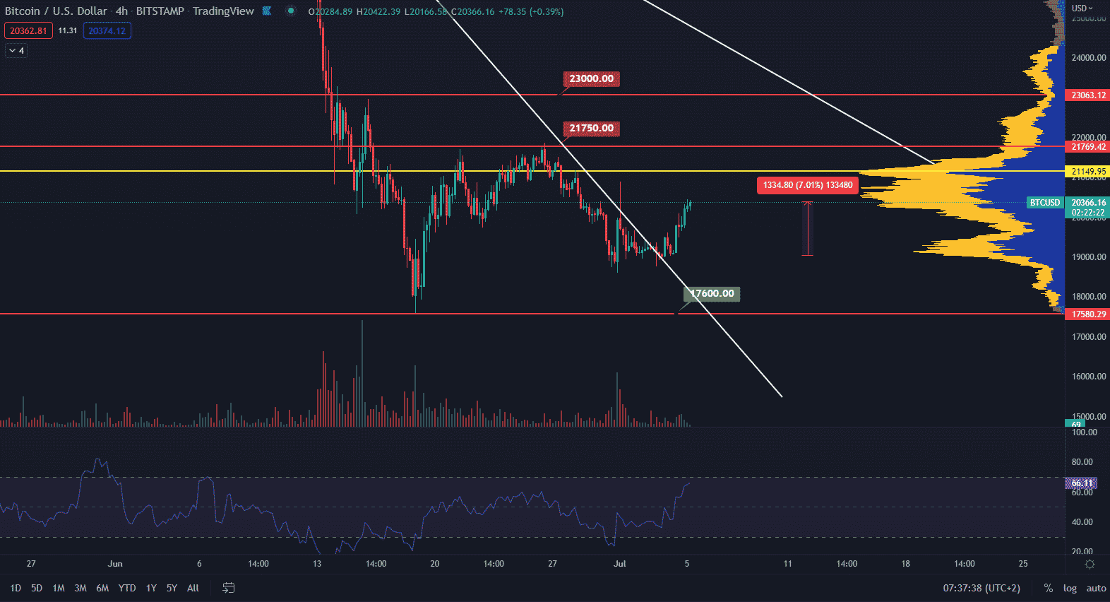 V prvom rade je podstatné povedať, že aktuálny rastúci trend nie je z dlhodobého hľadiska významný a určite nesignalizuje reverziu trendu. Navyše, nie je podporený bullish objemami. Môžeme však sledovať target na hladine point of control 21 150 $. Trhová cena však stále zostáva v sideway štruktúre medzi 17 600 $ a 23 000 $.