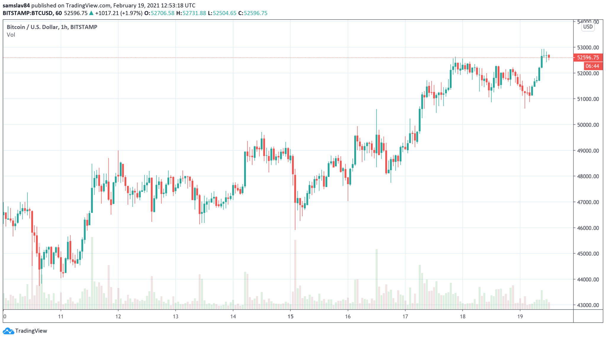 Trh s kryptomenami je vo štvrtok opäť v zelených číslach Hodnota Bitcoinu stúpla o 2,5% a pred pár hodinami atakovala hladinu 53 000 USD. Nechýba veľa, a táto kryptomena vstúpi to exkluzívneho klubu biliónových aktív. Pridá sa tak k technologickým gigantom, ako Apple, Microsoft, Google Amazon, či Saudi Arabico a komoditám, ako Zlato, striebro alebo ropa.