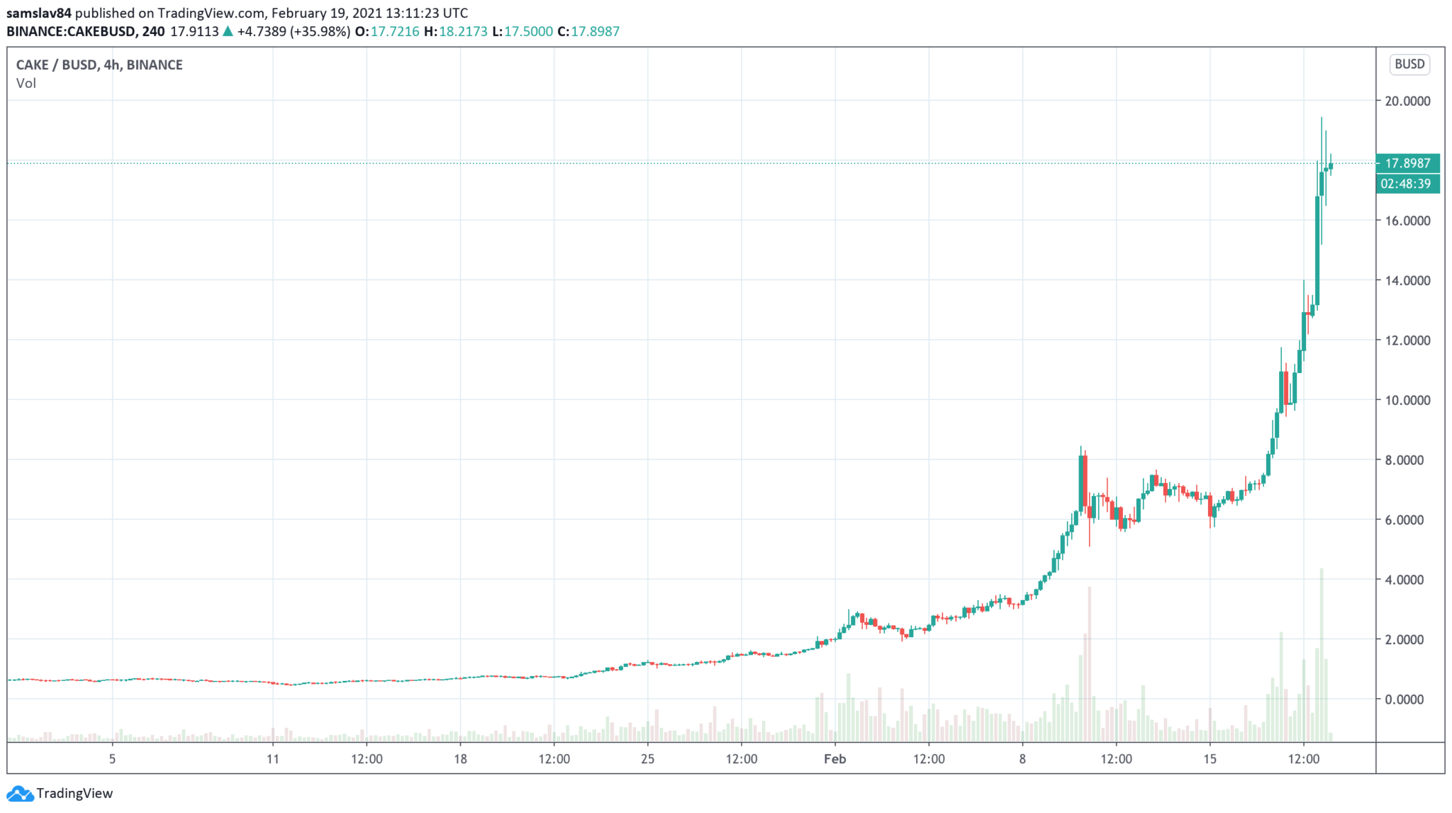 Burze PancakeSwap sa však napriek centralizácii tohto chainu darí. Včera objem zobchodovaných mincí na tejto platforme prekonal miliardu dolárov. Cena CAKE za posledných 24 hodín stúpla o 55% a na historickom maxime to bolo takmer dvadsať dolárov.