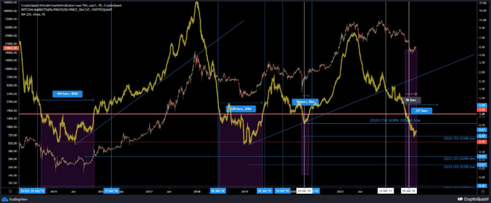Jednou zo zaujímavých metrík, ktorá potvrdzuje toto tvrdenie, je LTH SOPR SMA20 (LTH – long term hodlers, SOPR – Spent Output Profit Ratio, SMA – simple moving average). Táto metrika od CryptoQuant predstavuje 20-dňový jednoduchý kĺzavý priemer ukazovateľa vynaloženého výstupného zisku dlhodobých držiteľov.
