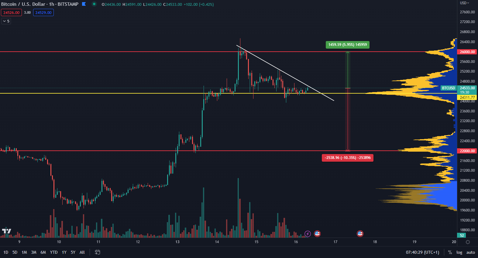 Na grafe nižšie môžete vidieť dva pravdepodobné scenáre v prípade, že cena pôjde smerom hore resp. dole. Krátkodobý klesajúci trojuholník sa uzatvára a support na bode kontroly 24 300 dolárov bude v tomto prípade smerodajný.