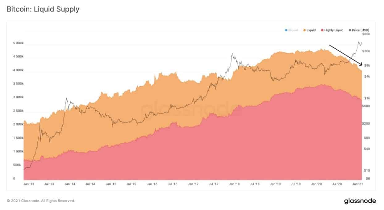 Analýza spoločnosti Glassnode odhaľuje, že objem dostupných (likvídnych) Bitcoinov na trhu klesá. Veľkí (ale aj malí) hráči skupujú stále väčšie množstvo mincí s cieľom dlhodobo ich držať a vyťahujú ich preč z kryptomenových búrz. Čím menej BTC je v obehu, tým viac rastie dopyt po tejto kryptomene a cena rastie.