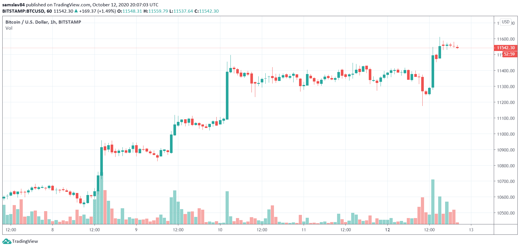 Bitcoin vera uzavrel weekly sviecu nad kľúčovou rezistenciou 11 000 $, no tým jeho rallye rozhodne neskončilo. Dnes spravil ďalšiu pumpu a dosiahol 11 600 $. Na hodinovom grafe tak vytvára akési schody, po ktorých sa šplhá stále vyššie.