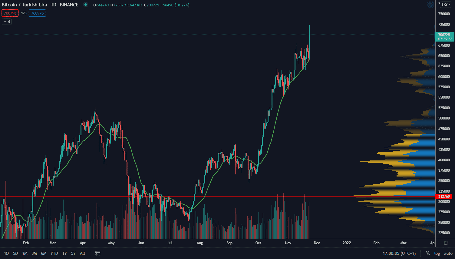 Zatiaľ čo sú Turci svedkami poklesu ich kúpnej sily v reálnom čase, tí s alokáciou BTC môžu pravdepodobne oslavovať viac ako kedykoľvek predtým. BTC/TRY dosiahol v utorok na Binance 723 329 tureckých lír, čo je posledné zo série historických maxím, ktoré prichádzali takmer nepretržite.