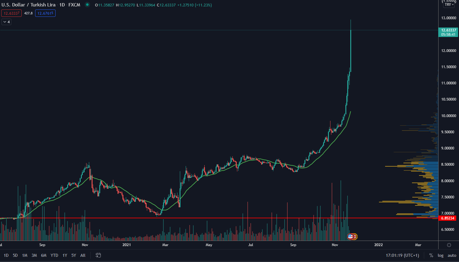 Turecko neoficiálne bojuje s menovou krízou, keďže prezident Recep Tayyip Erdoğan tlačí na udržanie nízkych úrokových sadzieb. Výsledkom bol kolaps výmenného kurzu líry, pričom USD/TRY len v utorok zaznamenal rast 14 %.