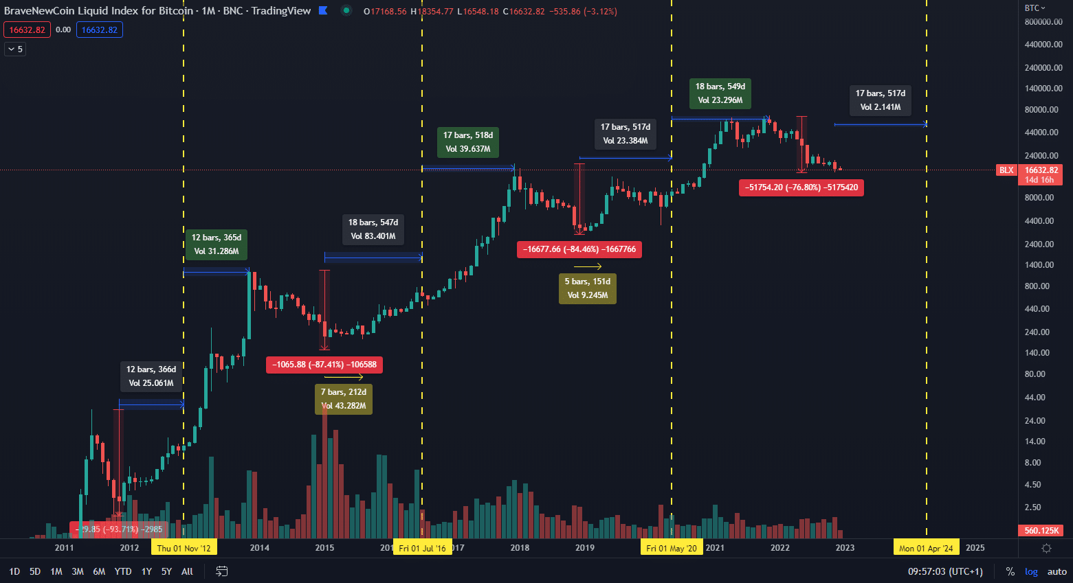 Táto predpoveď vychádza z historických údajov, pričom analytik poznamenáva, že Bitcoin má tendenciu konsolidovať niekoľko mesiacov po vytvorení dna. Na grafe nižšie môžeme vidieť v žltých rámčekoch ako dlho približne trvali predošlé konsolidačné fázy bezprostredne po sformovaní dna korekcie.