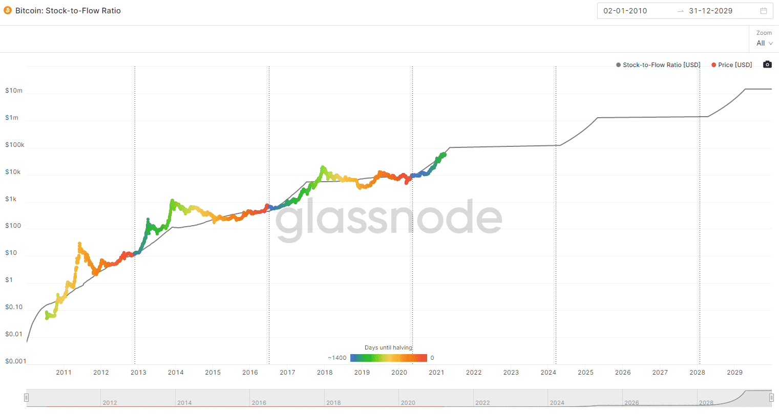 Pre Bitcoiny existuje niekoľko modelov Stock-to-Flow, ktoré ukazujú vývoj ceny Bitcoinu v súlade s halvingom a ponukou v priebehu času. Nasledujúci obrázok poukazuje na Stock-to-Flow spoločnosti Glassnode.