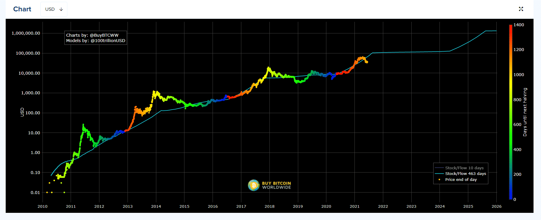 Podľa stock to flow modelu by sa cena už tento rok mala stabilizovať na hodnote okolo 100 000 USD. Samozrejme môže mať aj veľké výkyvy od priemernej moving average hodnoty. Tým sa Bitcoin už dlhodobo vyznačuje. Avšak čo sa týka férovej ceny, tak už teraz by podľa tohto modelu mala byť okolo 60 000 USD. To znamená, že Bitcoin je podhodnotený a tvorí sa nám zaujíma príležitosť na nákup.