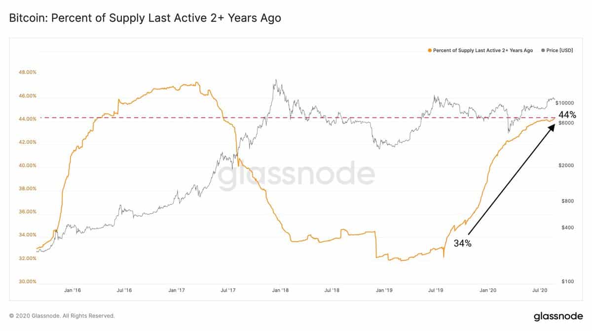 Dáta zo zdroja Glassnode ukázali, že približne 8 miliónov bitcoinových tokenov sa nepresunulo najmenej tri roky. To predstavuje 44 percent z celkovej ponuky kryptomeny. Ide tak o zásadný objem z celkovej ponuky. Nasledujúci graf poukazuje na to, že takéto vysoké percento hodlerov sa vyskytovalo iba počas posledného bull runu. Ide tak o býčí signál.