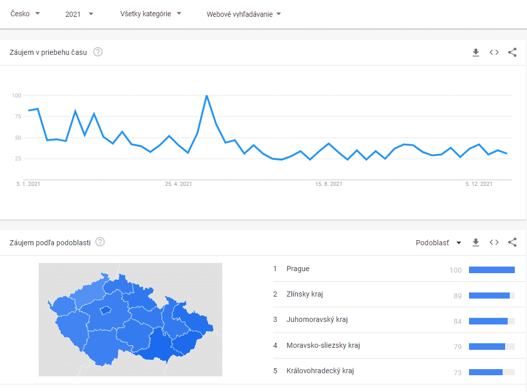 Google trends Bitcoin Česko 2021. Zdroj: Google trends