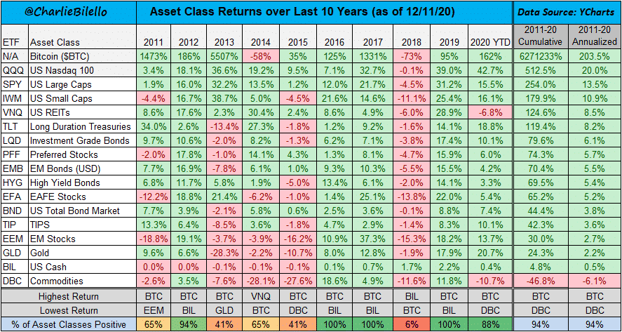BTC dosahuje ročný výnos zhruba 200%. Rok 2020 bol pre hodlerov kľúčovým rokom, pretože bitcoiny tromfli akcie, zlato a ďalšie makro investície. Oproti minimu 3,600 dolárov v marci je BTC / USD hore až o 420%. Poďme sa spolu pozrieť na porovnanie s ostatnými aktívami.