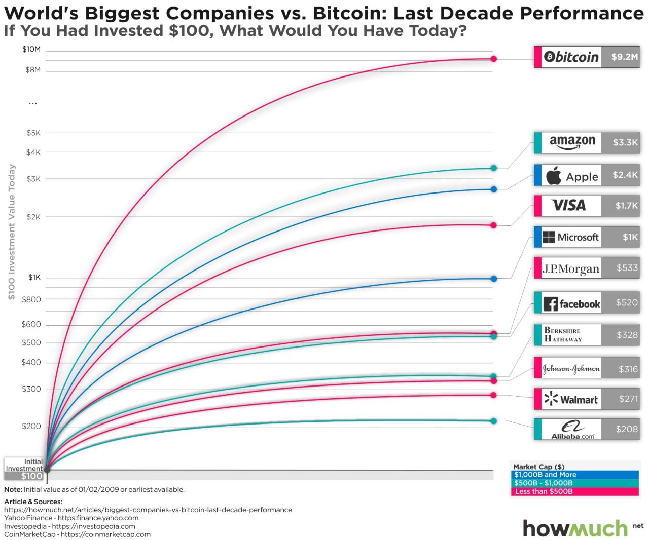 Či už ide o spriemerovanie nákladov v dolároch alebo o jednorazovú investíciu pred desiatimi rokmi vo výške 100 dolárov, bitcoin za posledné desaťročie prevyšuje ďalšie investície ako Apple alebo Amazon.