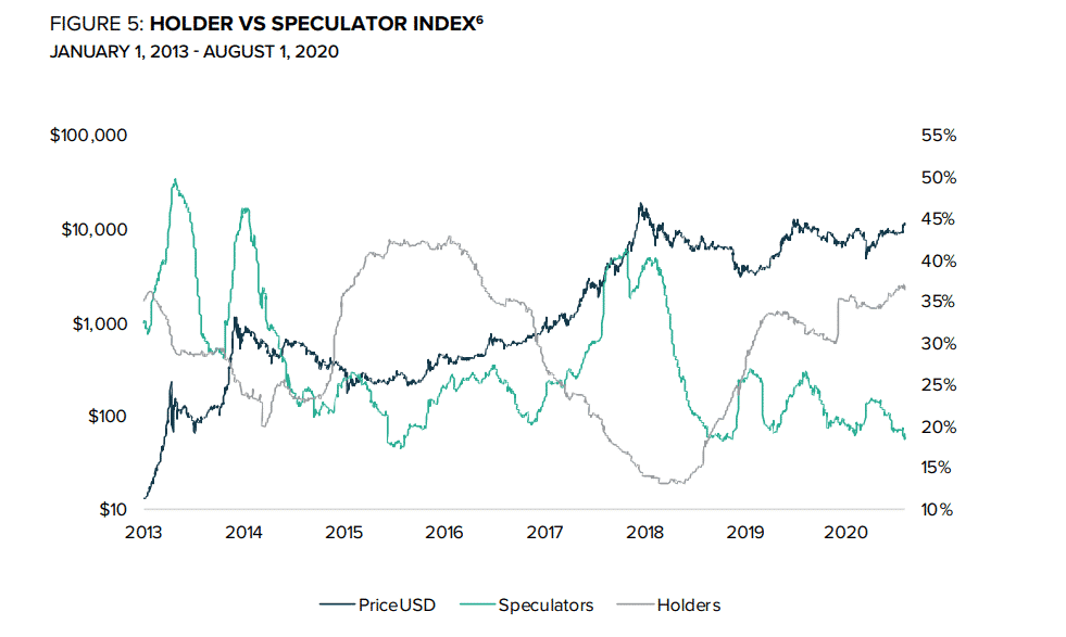 Spoločnosť Grayscale sa zamerala na analýzu blockchainu a porovnanie špekulatívnych coinov na trhu (adresy, kde sa coiny pohli v posledných 90 dňoch) proti adresám Hodlerov – adresy, kde sa coiny nepohli viac než tri roky. Index HSI (Hodler-Speculator Index) vykazuje historické maximá.