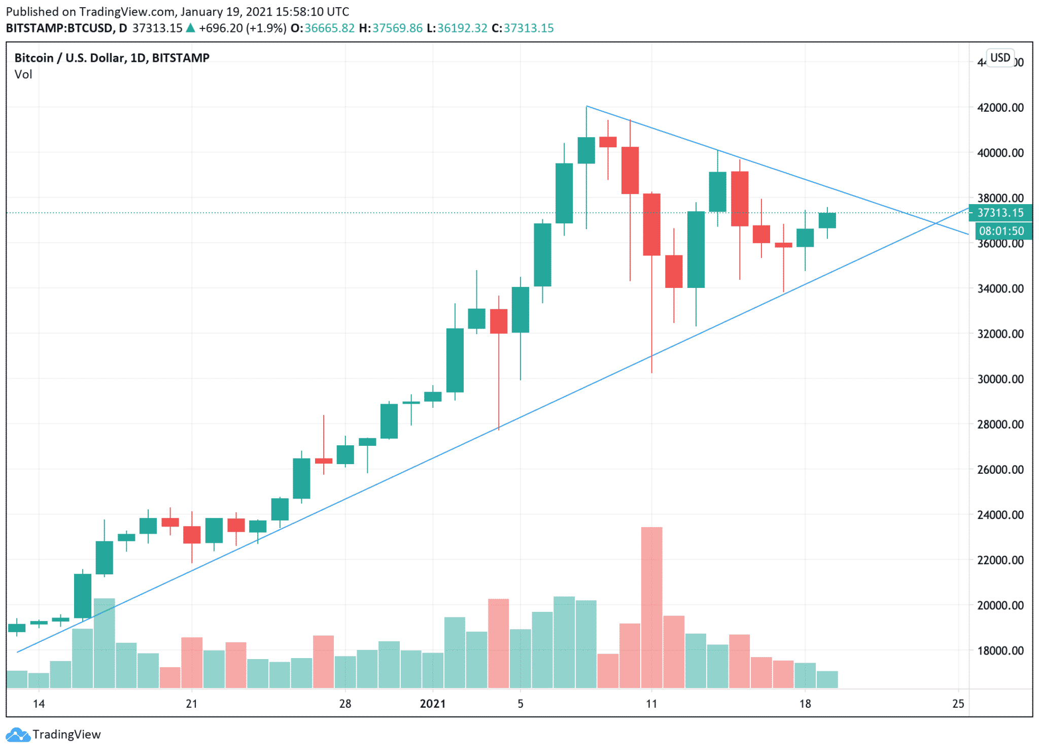 V najbližších dňoch však Bitcoinu rastúci trend môže narušiť stred stúpajúcej a klesajúcej trendline. Bitcoin po prudkom raste konsoliduje v rovnoramennom trojuholníku. A až dosiahne jeho cíp, bude sa definitívne rozhodovať, ktorým smerom sa vydá.