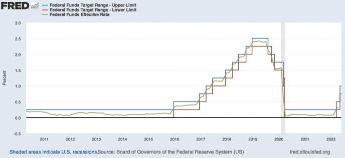 Fed prostredníctvom svojho Federálneho výboru pre voľný trh (FOMC) zvyšuje alebo znižuje úrokové sadzby. V podstate tak stanovuje cieľové rozpätie. V uvedenom grafe je dolná a horná hranica tohto cieľového rozpätia znázornená červenou, resp. modrou farbou. Pre komerčné banky to slúži ako určité odporúčanie.