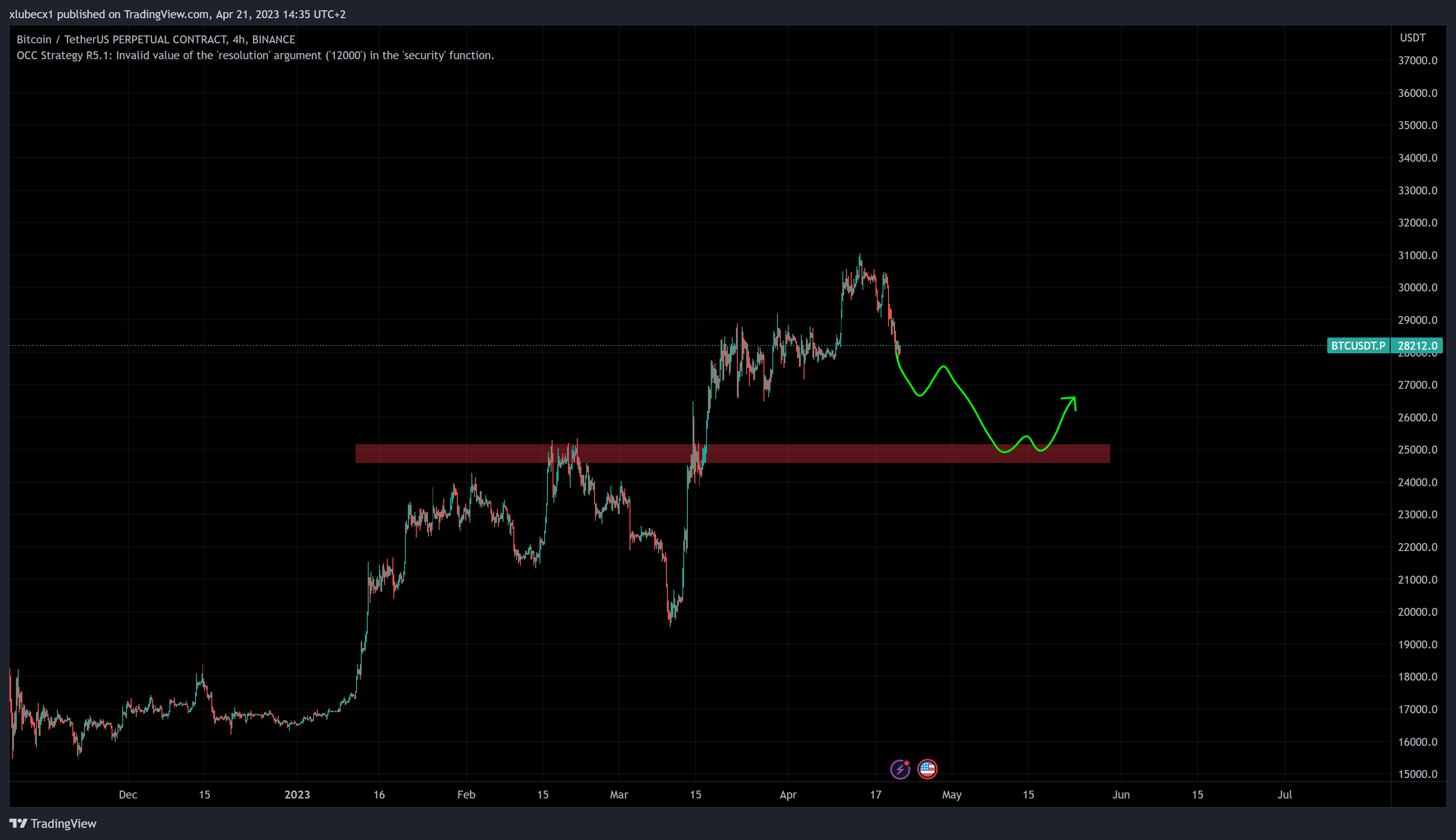 Aktuálna dynamika poklesu najznámejšej kryptomeny nám naznačuje, že sa dostáva do korekčného pohybu. V súčasnosti môže cena spadnúť až na 25 000 dolárov. Je to úroveň, kde bola v minulosti niekoľko mesiacov silná rezistencia. V súčasnosti sa z tejto úrovne stáva podporná bariéra alebo aj supportná úroveň. Viac o obchodovaní supportov a rezistencií sa dočítate v našom návode.