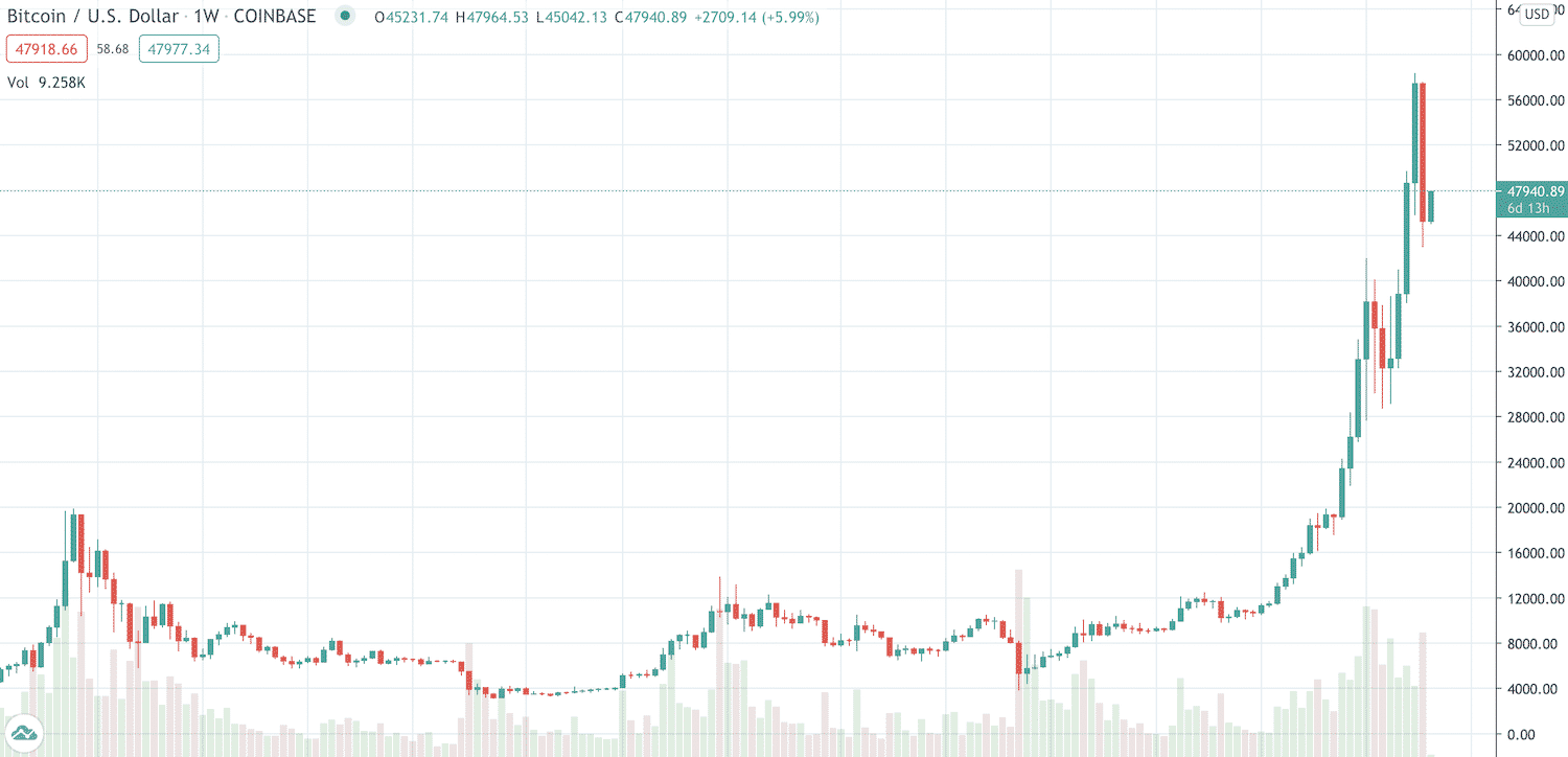 Máme za sebou naozaj drsný týždeň. Na trhu s kryptomenami minulý pondelok vznikla panika po tom, čo Bitcoin padol o 10 000 dolárov na $48 000. Korekcia potom pokračovala až do nedele. Lokálne minimum sa nachádza na cene 43 100 dolárov.
